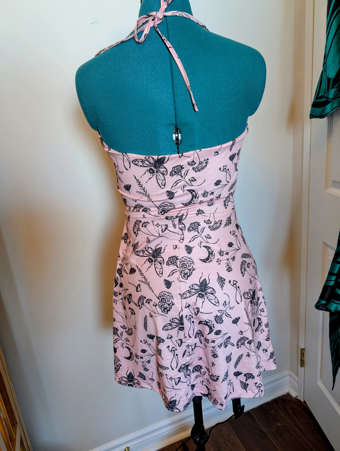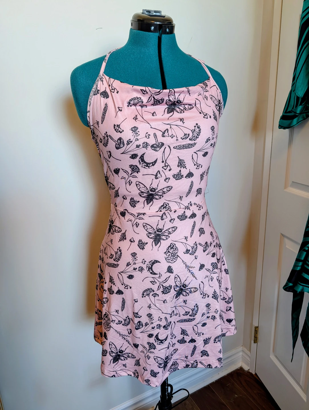 This pink halter dress features a black print of moons, mushrooms, and insects. It has a flattering fit-and-flare silhouette. Made of a stretchy fabric for comfort.