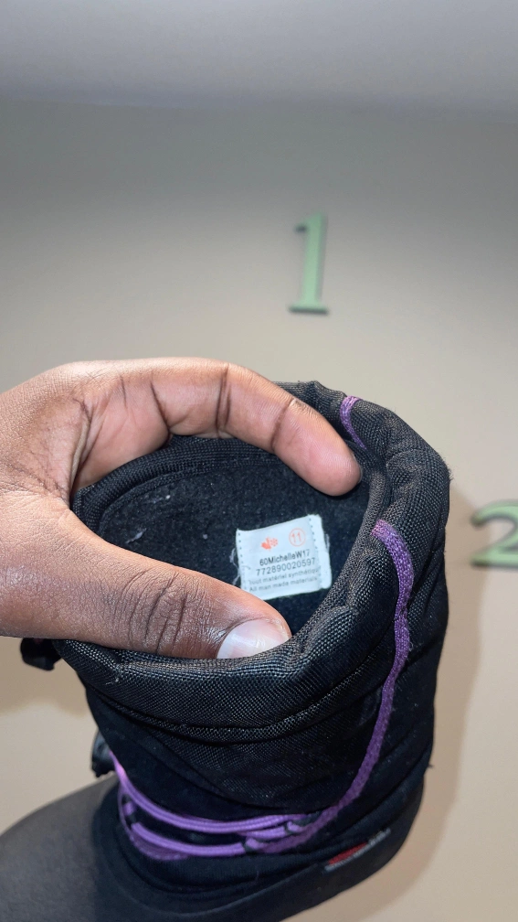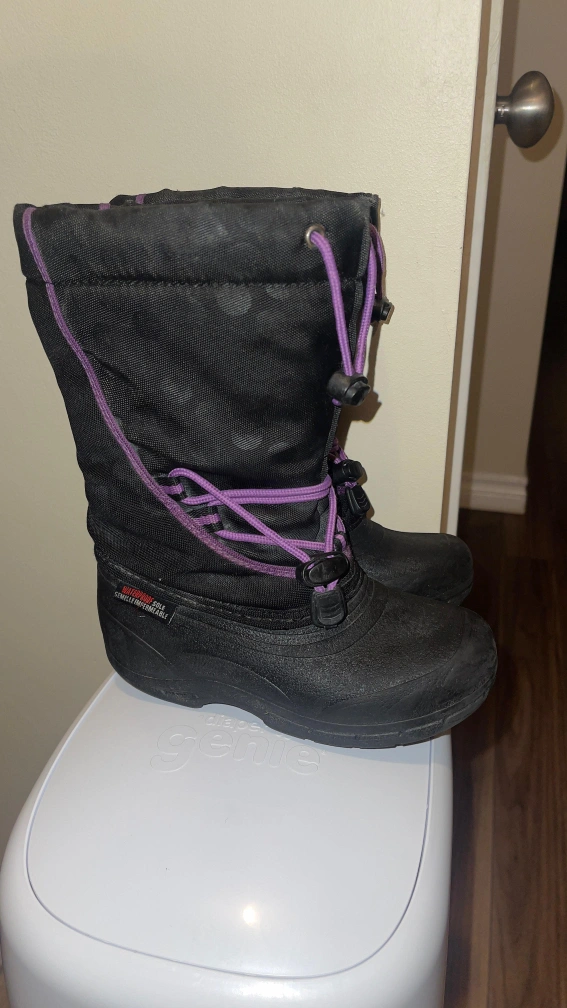 Black Sorel winter boots with purple accents and laces. They have a waterproof outer shell. Kid Size 11.