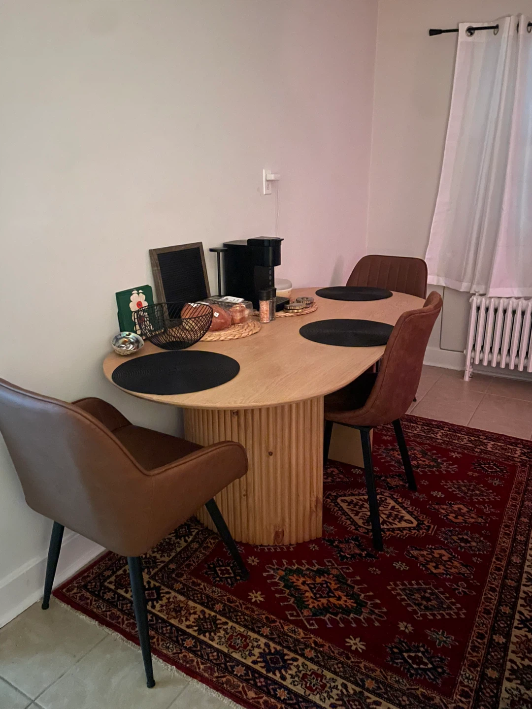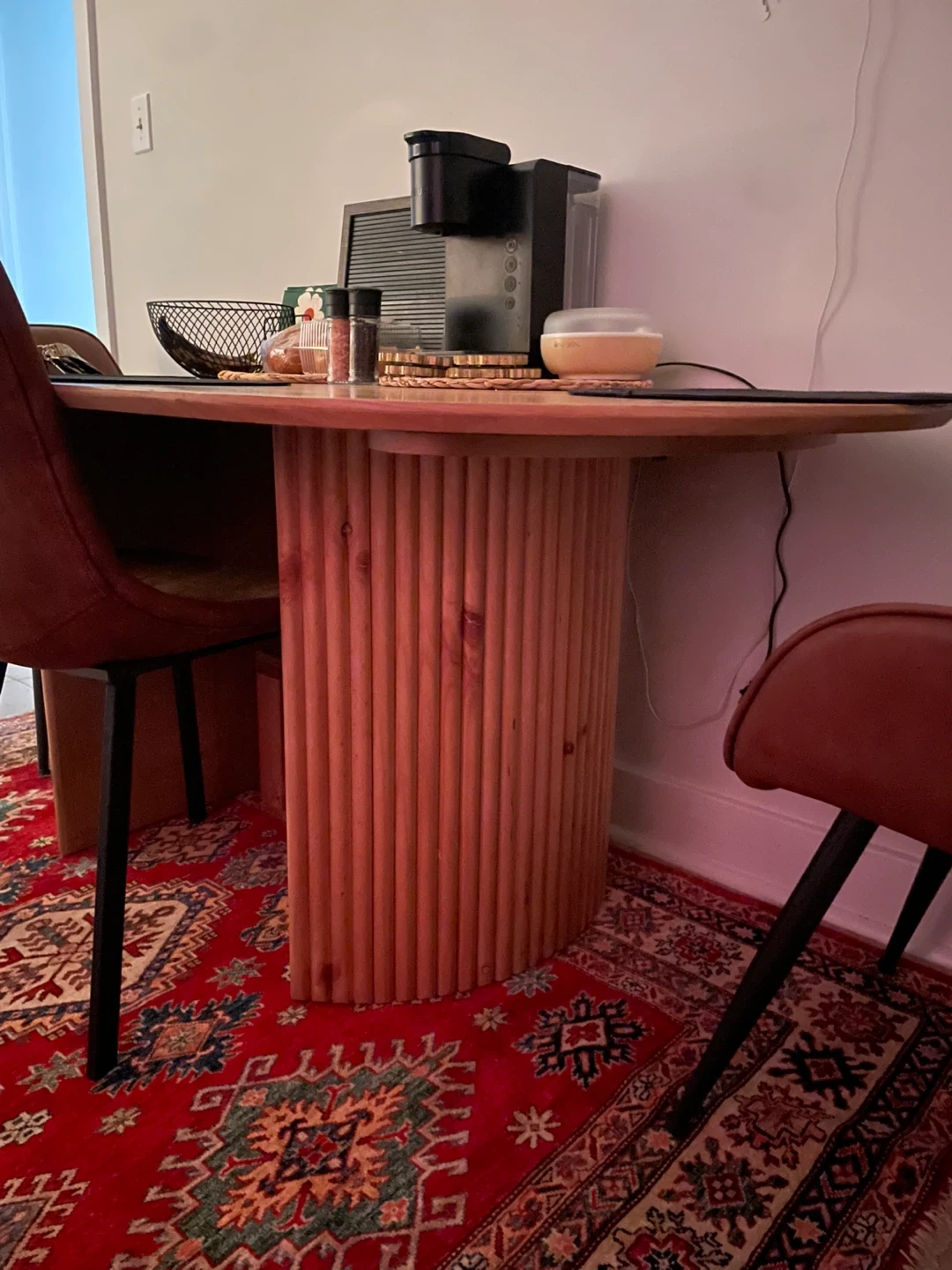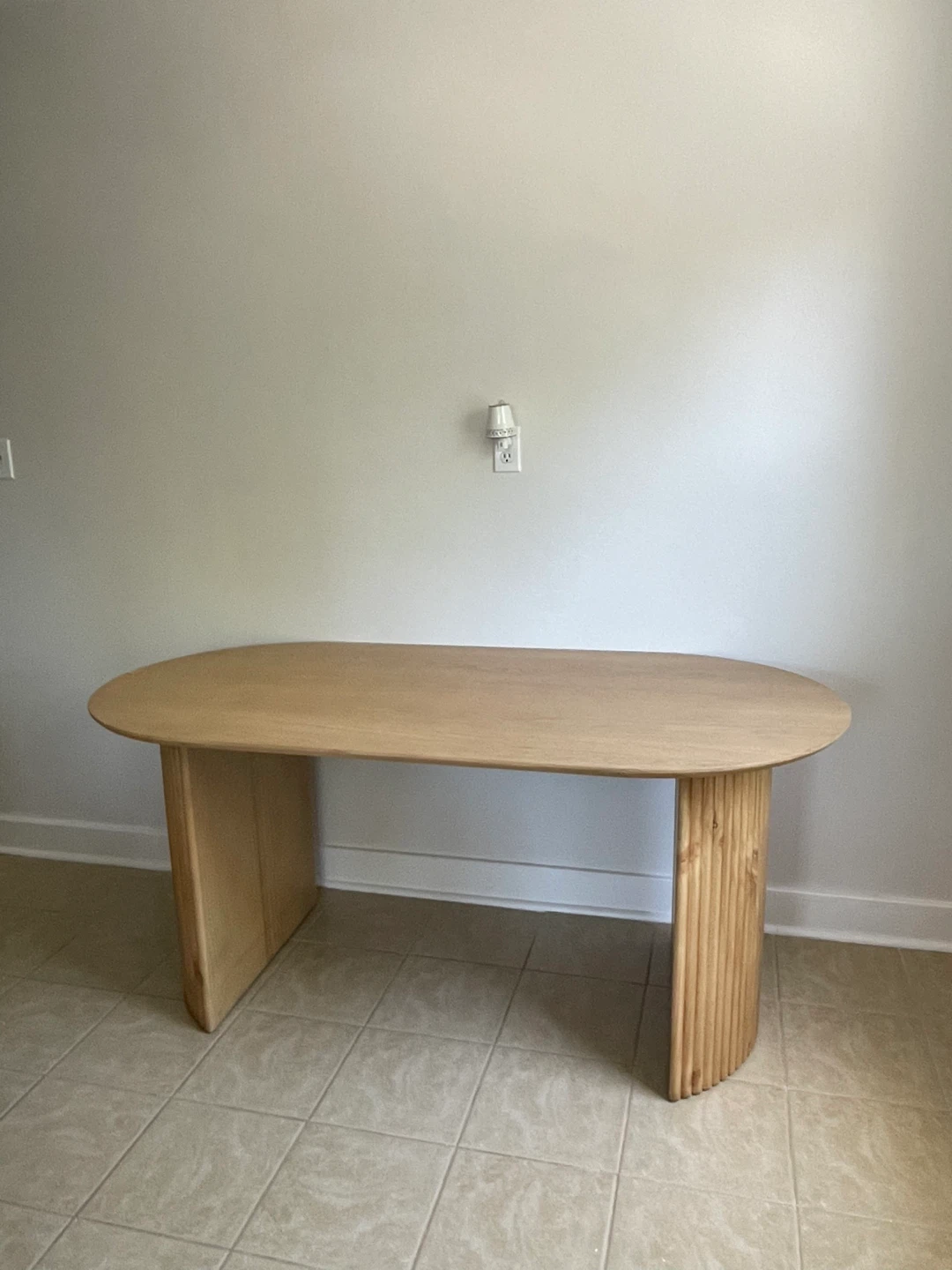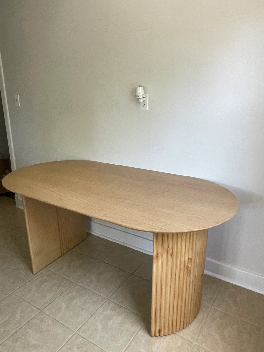 A modern oval dining table with a ribbed pedestal base. It's made of light-coloured wood. This table comfortably seats four people. It's a great focal point for a kitchen or dining area! Originally came damaged in the mail and partly built. Dimensions 67 x 37.5 inches.
