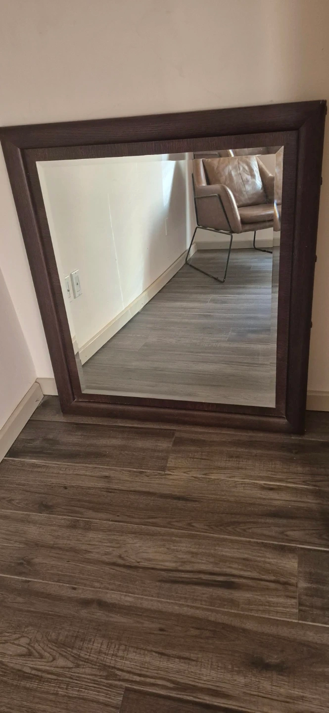 A substantial framed mirror with a dark wood-look border. It's perfect for adding depth and light to any room. The frame has a textured finish.