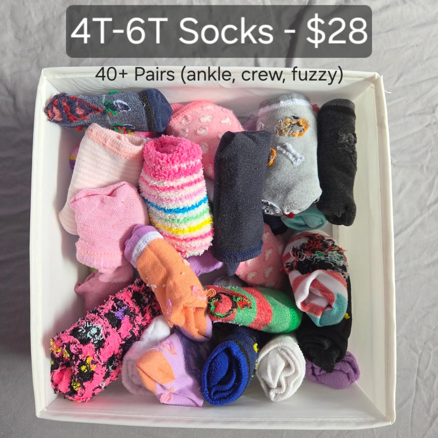 This is a lot of 40+ pairs of kids' socks. Includes ankle, crew, and fuzzy styles. They come in assorted colours and patterns (Paw Patrol, Elf on the Shelf). Perfect for stocking up!