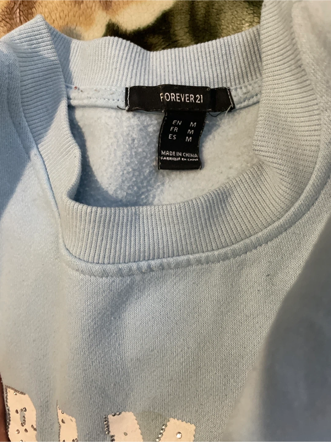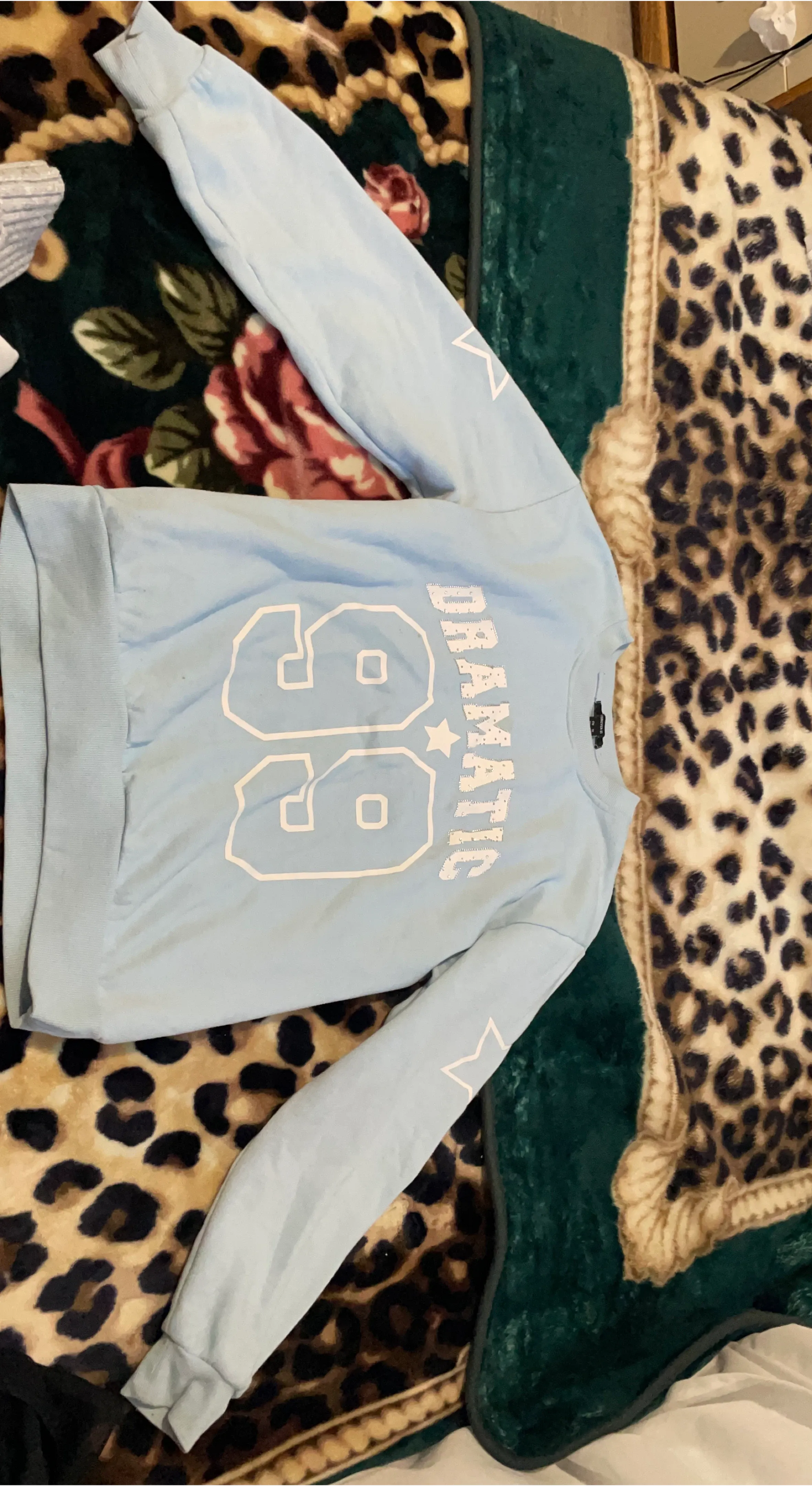 This light blue sweatshirt from Forever 21 features a "99 Dramatic" graphic design with star accents. It's a size medium, made in China. The fabric is soft and comfy, great for casual wear! I got these from Urban Planet and wore it few times.