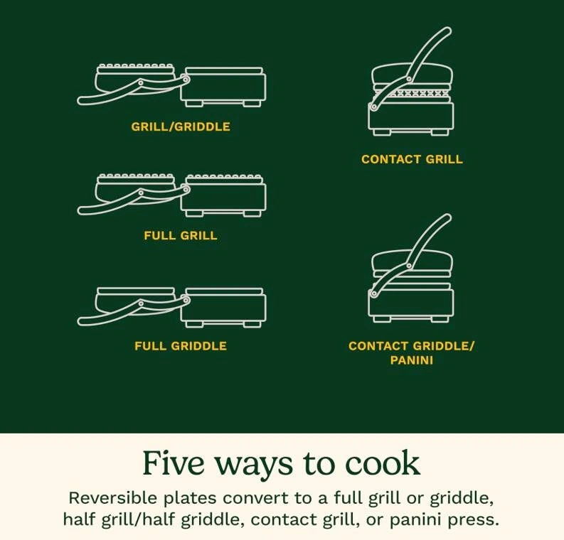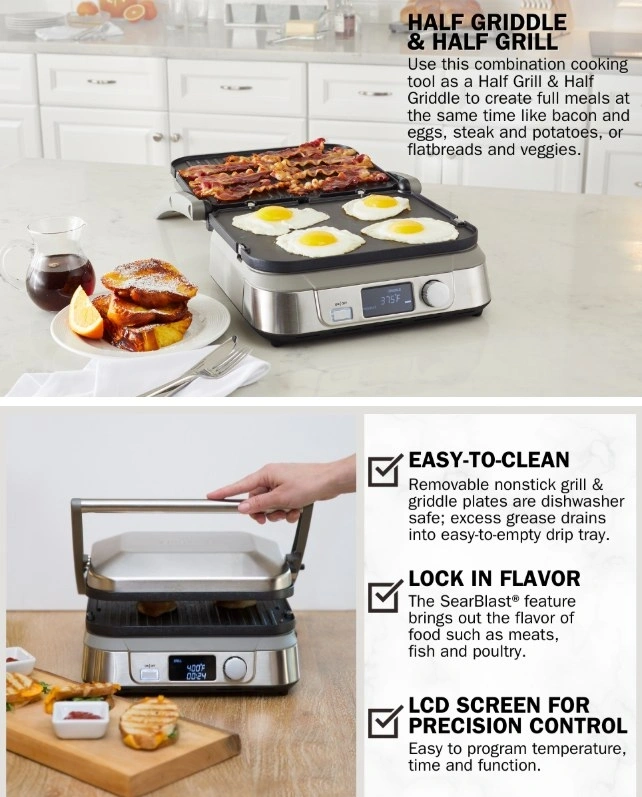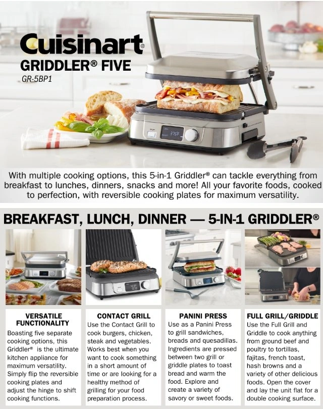 Cuisinart GR-5BP1 Electric Griddle FIVE. Enjoy 5-in-1 Functions, LCD Display, Wide Temperature Range and Sear Function, Stainless Steel. The Griddler FIVE has a sleek contemporary design and can be used as a contact grill, panini press, full grill, full griddle, and half grill/half griddle. The LCD Display shows function, temperature, and timer with user-friendly digital controls, top cover and handlebar. Adjustable temperatures from 175 - 450 degrees with a sear function.