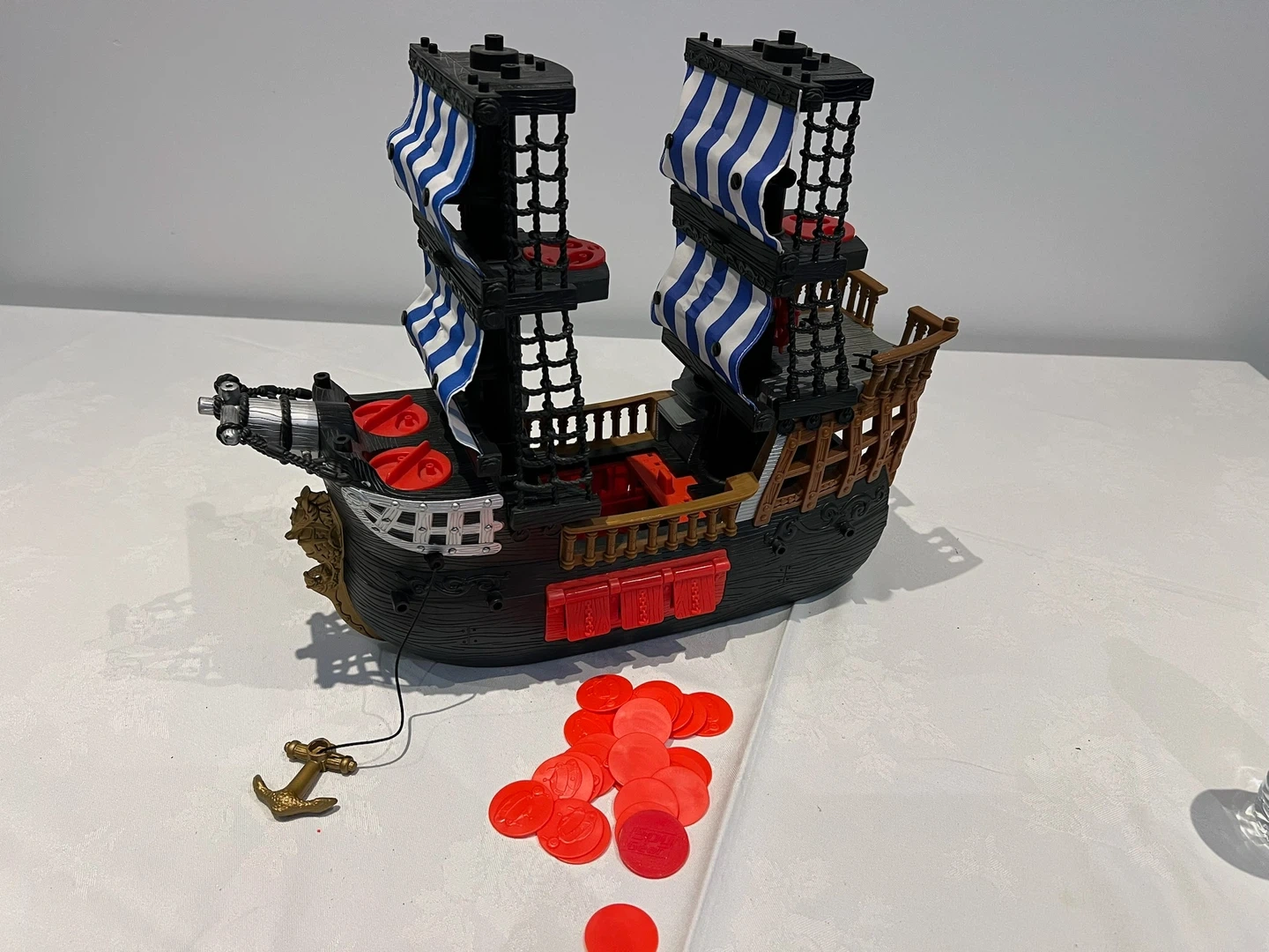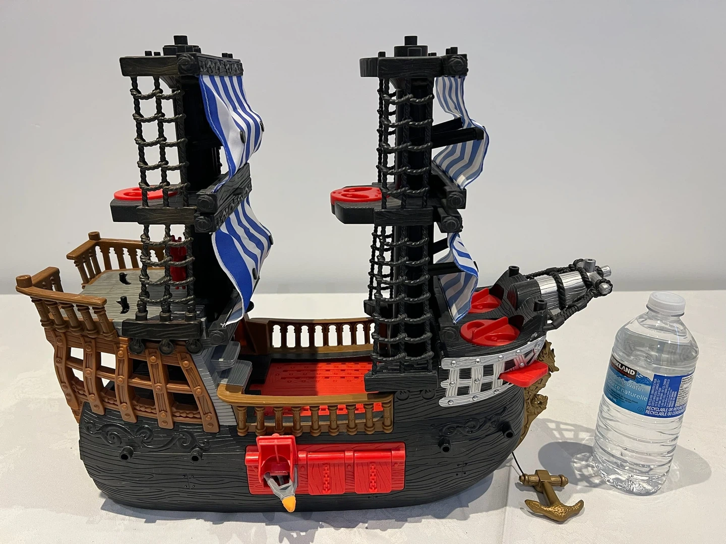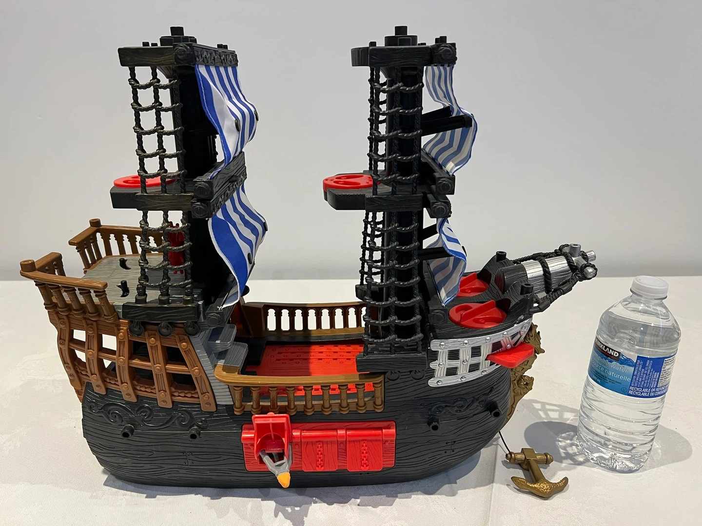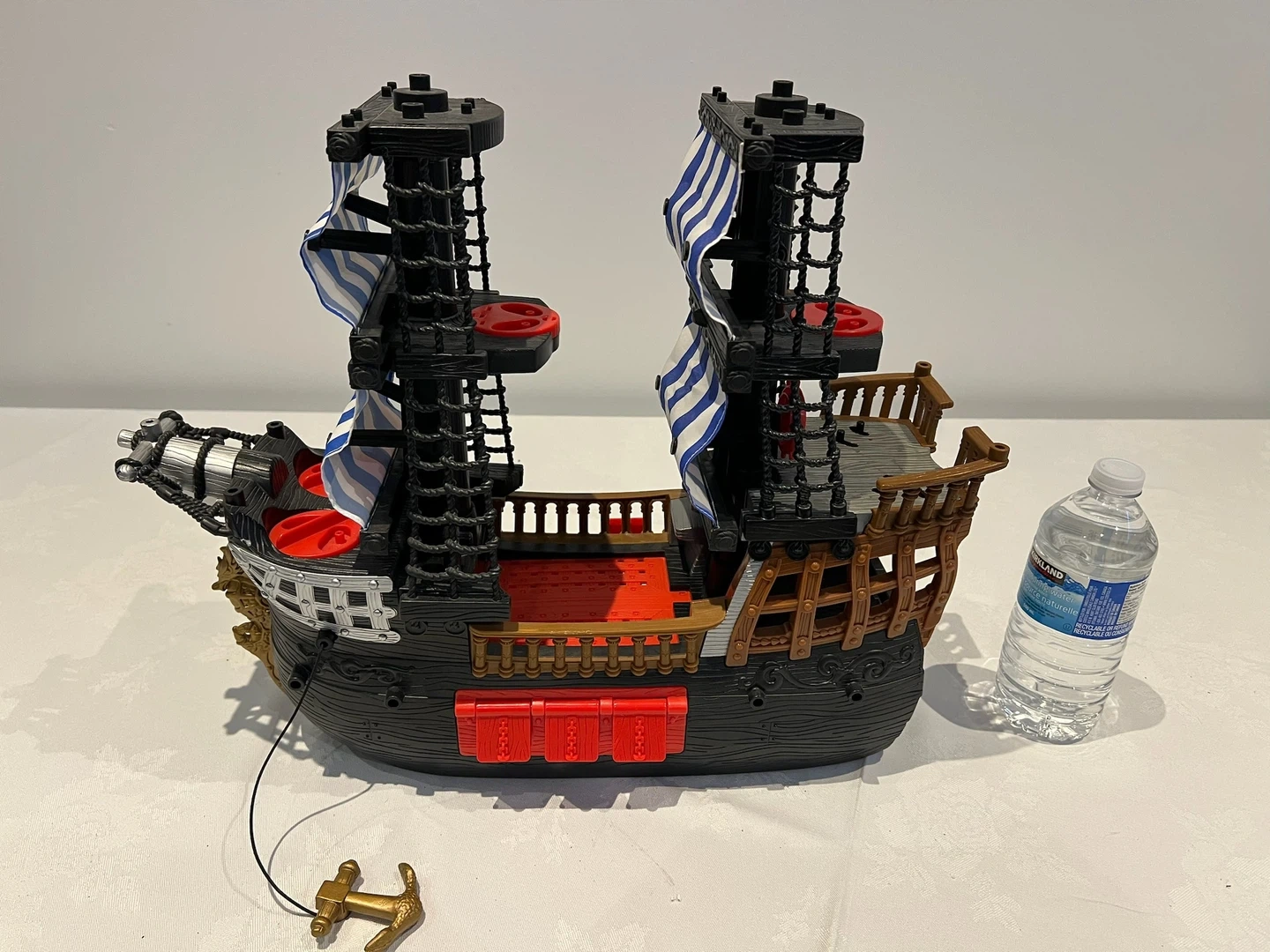 This is a Fisher-Price pirate ship toy. It's made of plastic and comes with a golden anchor accessory. It features two masts with blue and white striped sails.