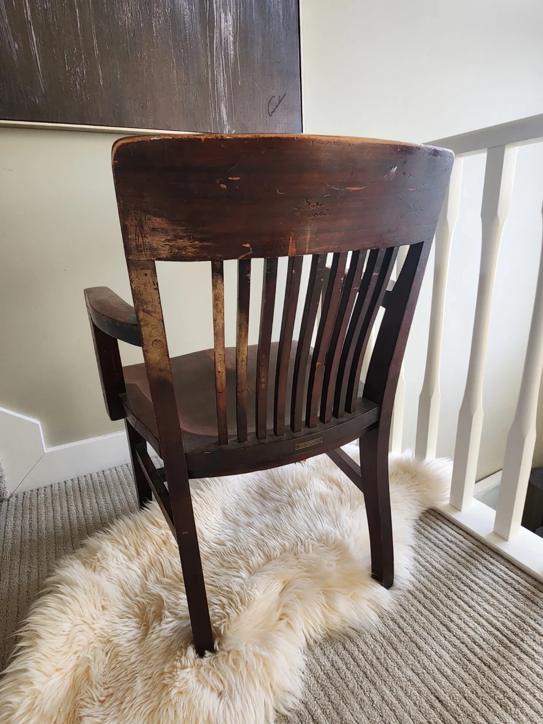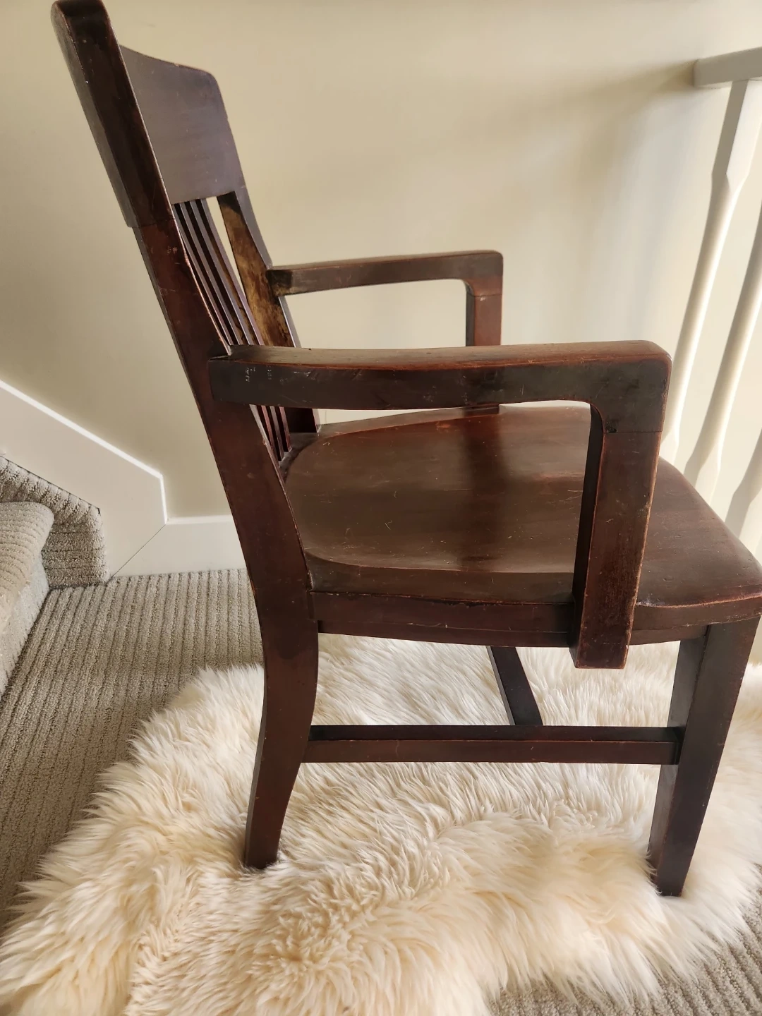 This collectible 1920s chair has a gorgeous craftsman design. This Sturdy and stylish armchair by John Wanamaker furniture designers is a lovely dark wood chair with a slatted back and arms. Perfect for a study or library space! Seat surface is 20 x 20, seat is 17 inches high, top of chair back is 33 inches high and the arms are 22 inches apart.