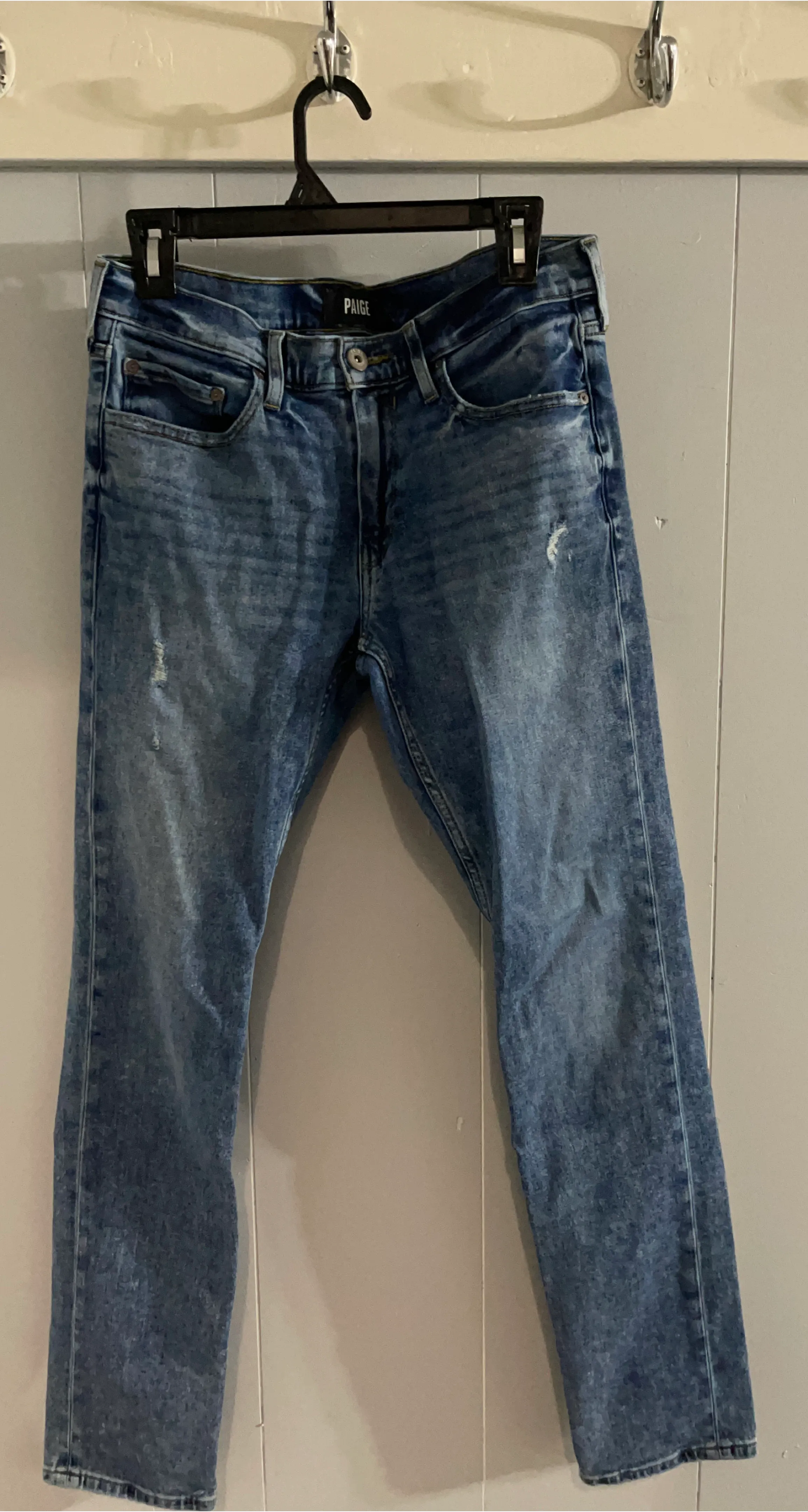 PAIGE men's blue denim jeans with a distressed look. These jeans are made from a durable denim fabric. They're a versatile addition to any casual wardrobe!