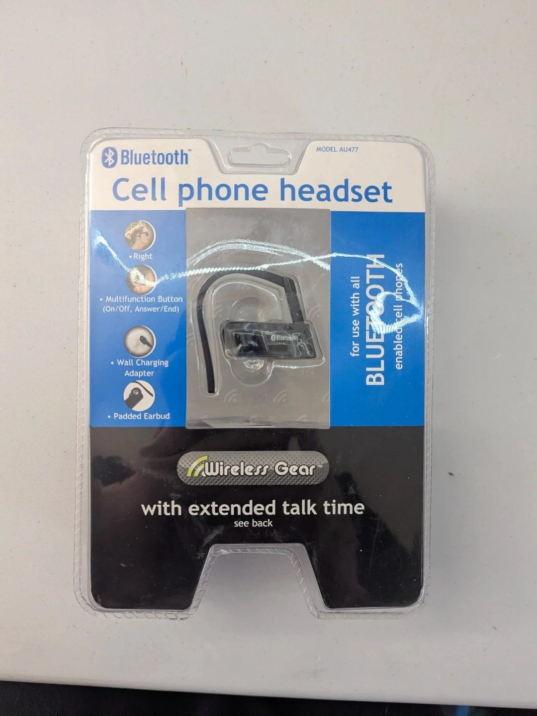 This Wireless Gear Bluetooth cell phone headset is designed for the right ear and offers extended talk time. It features a multifunction button for easy control and comes with a padded earbud for comfort. A wall charging adapter is included for convenience.