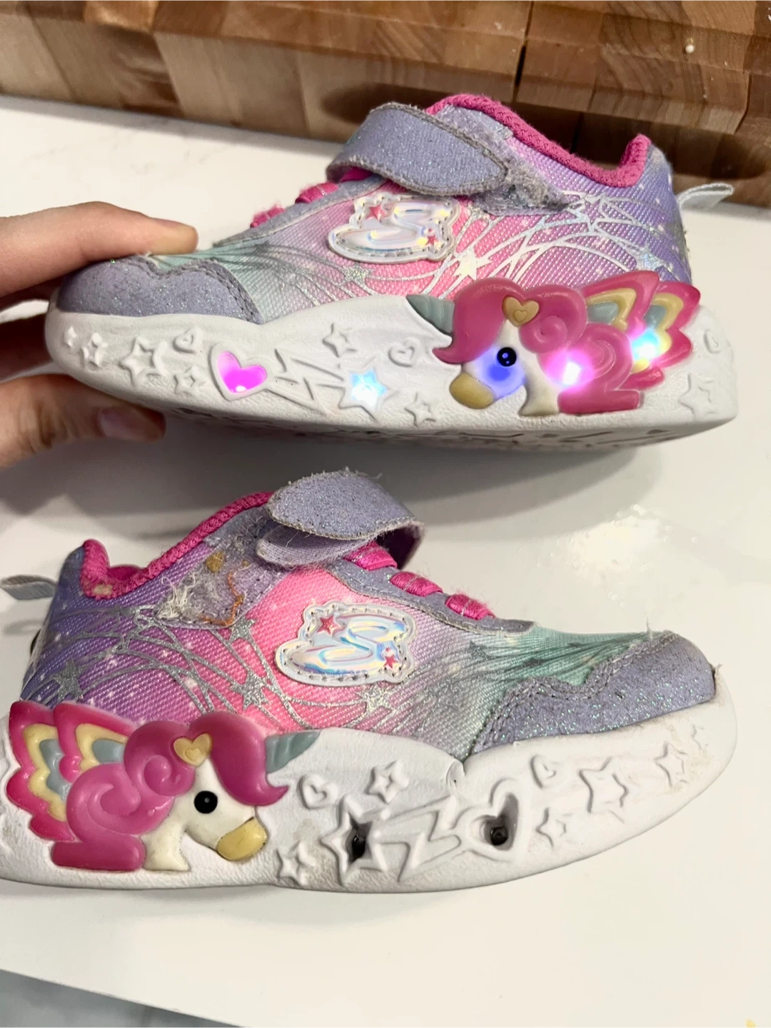 These Skechers light-up sneakers feature a fun unicorn design and were only worn by my daughter for a few months before she outgrew them! They are in good, clean condition (toddler size 6).