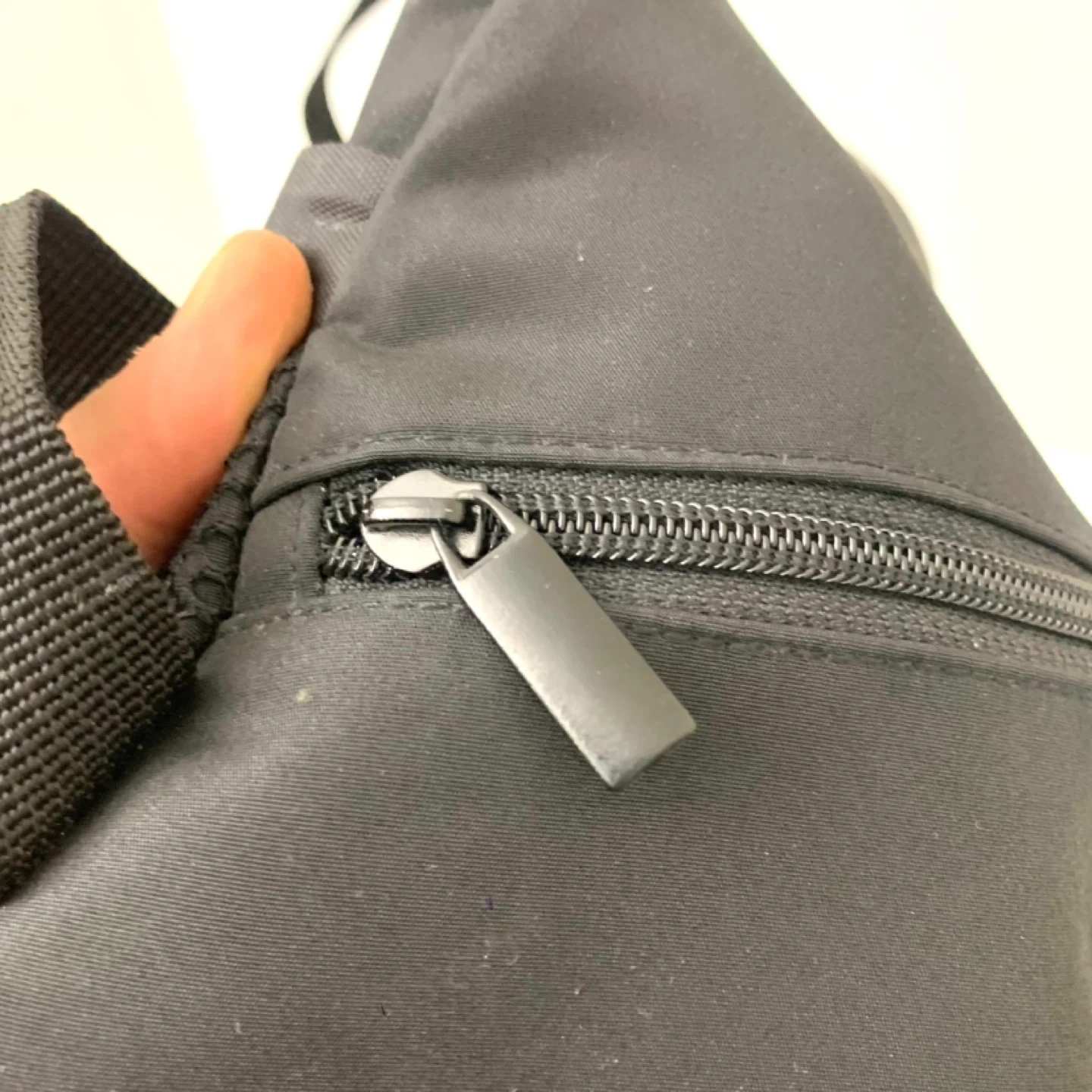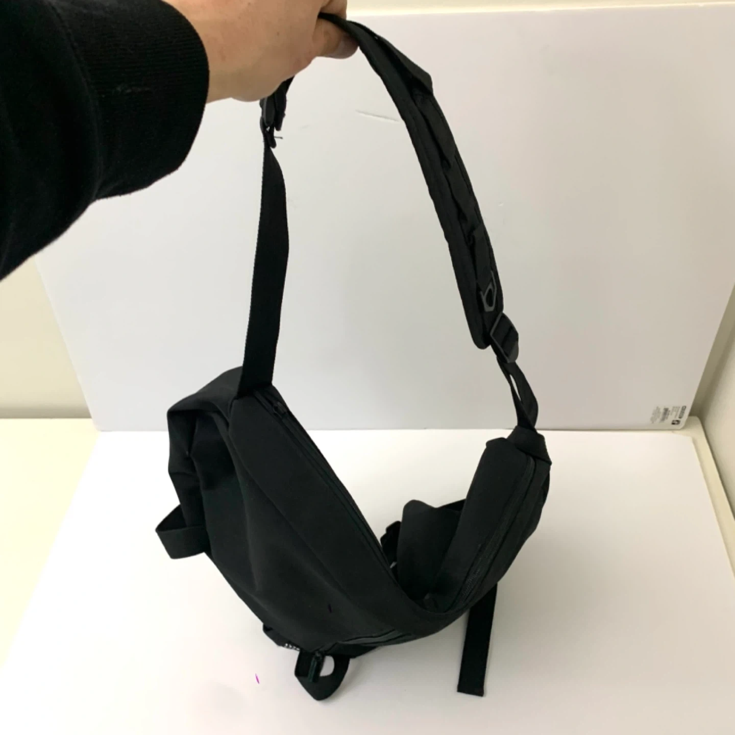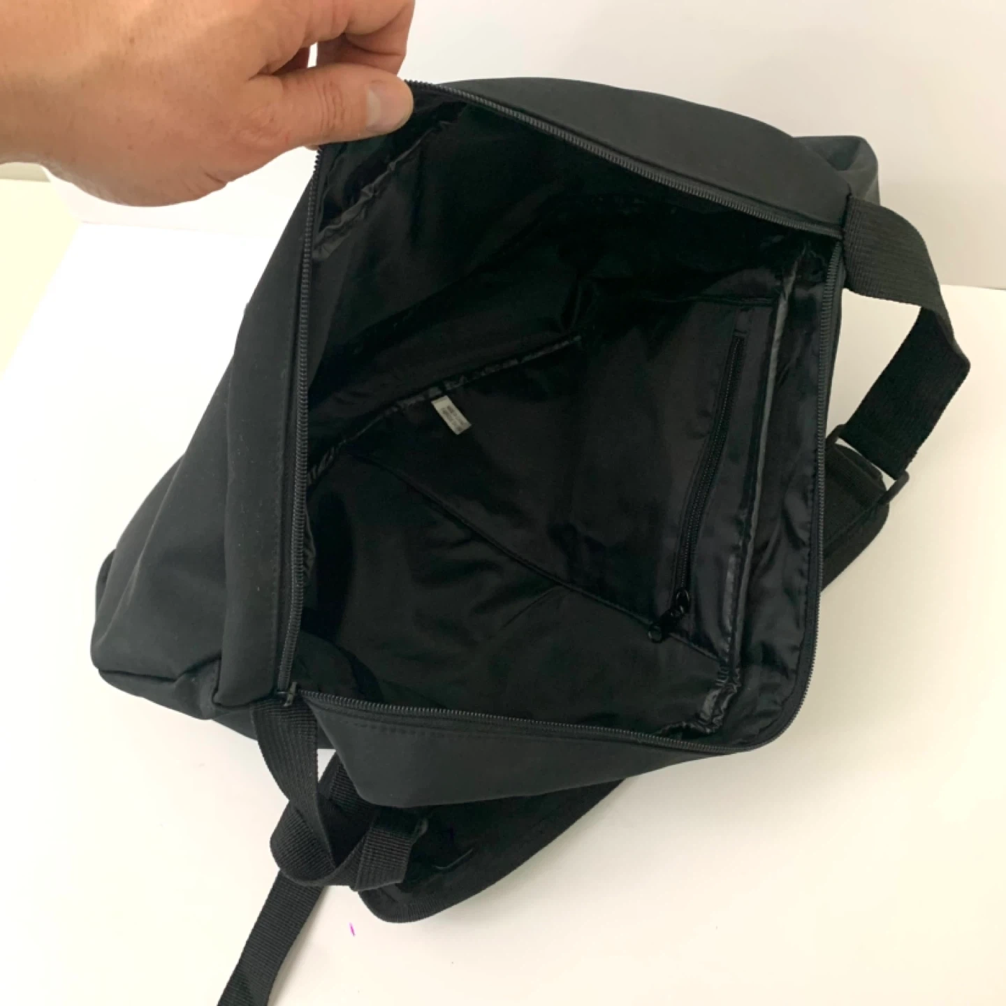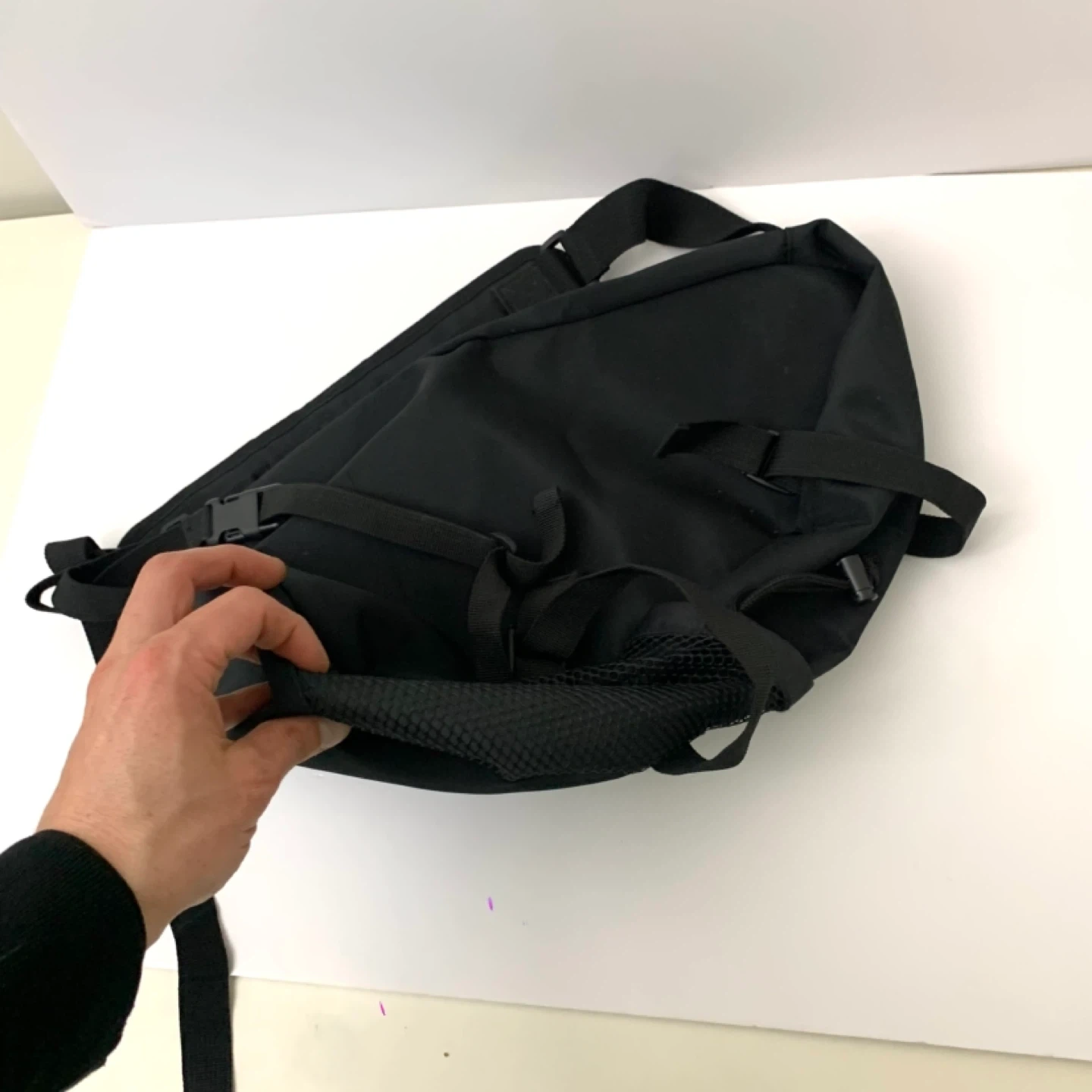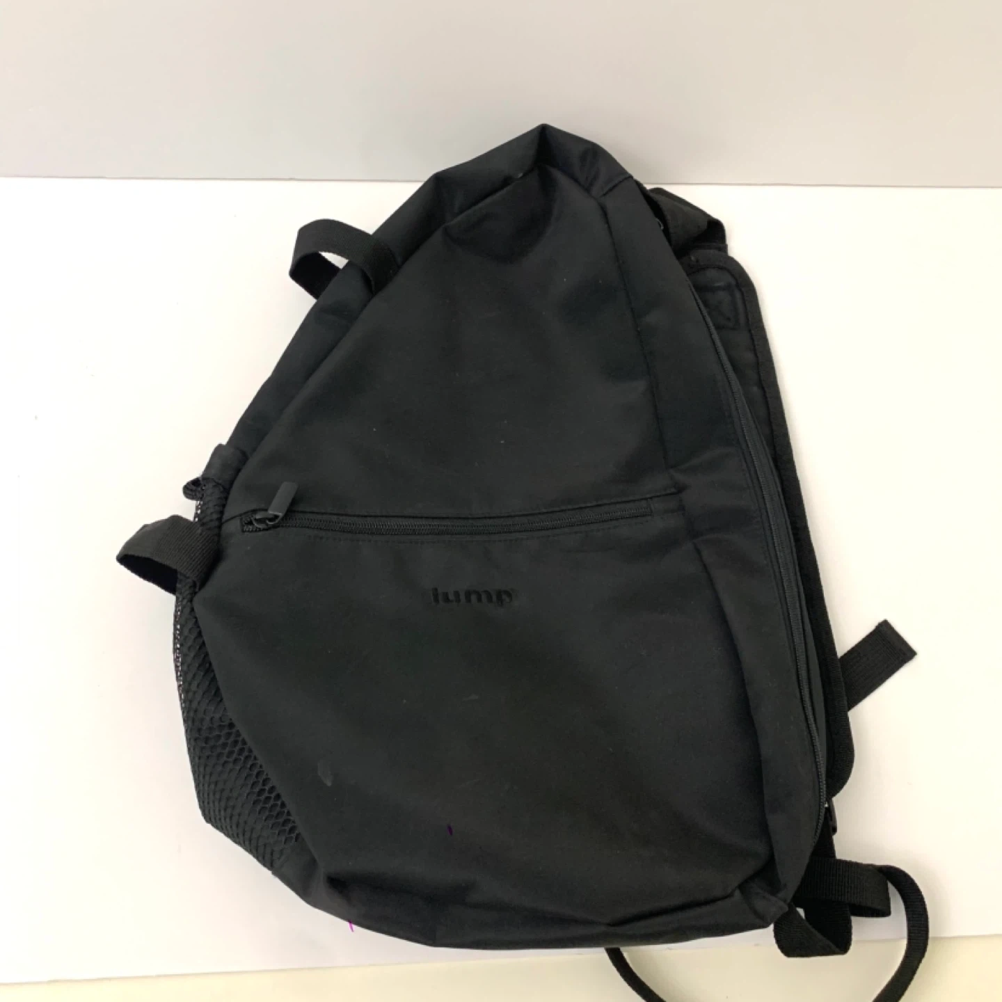 Sling backpack crossbody bag black nylon design perfect for travel, school, or everyday use. Lightweight with zippered main compartment, front pocket, and mesh side pocket for easy organization while staying comfortable on the go. Note: one zipper works but is missing the pull tag (see photos), priced accordingly.