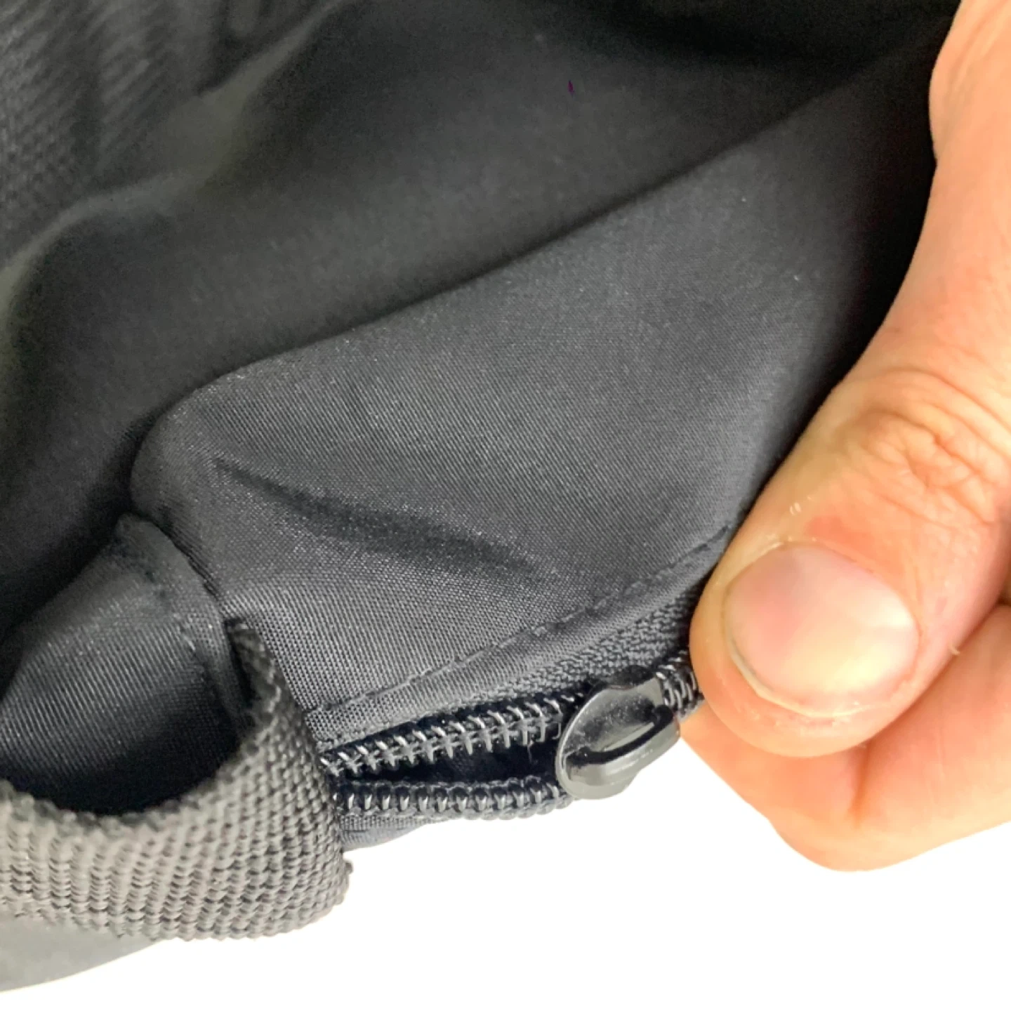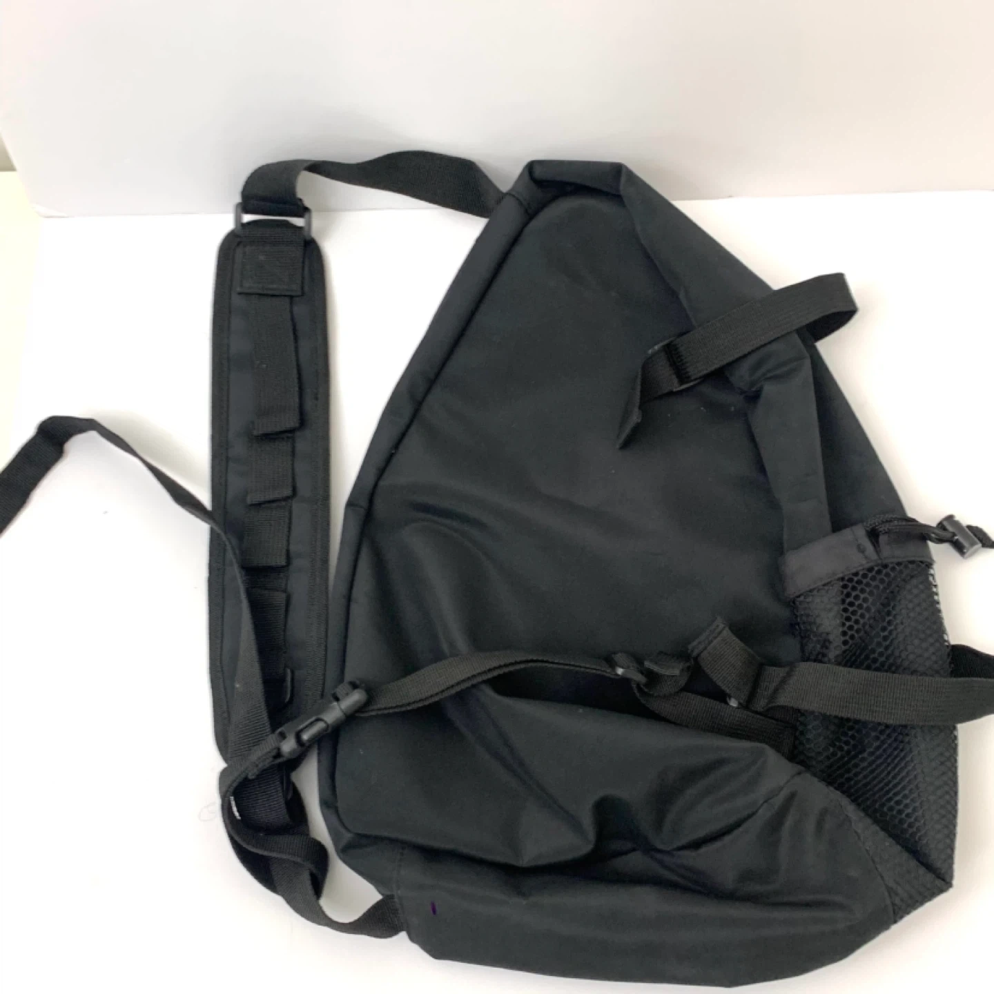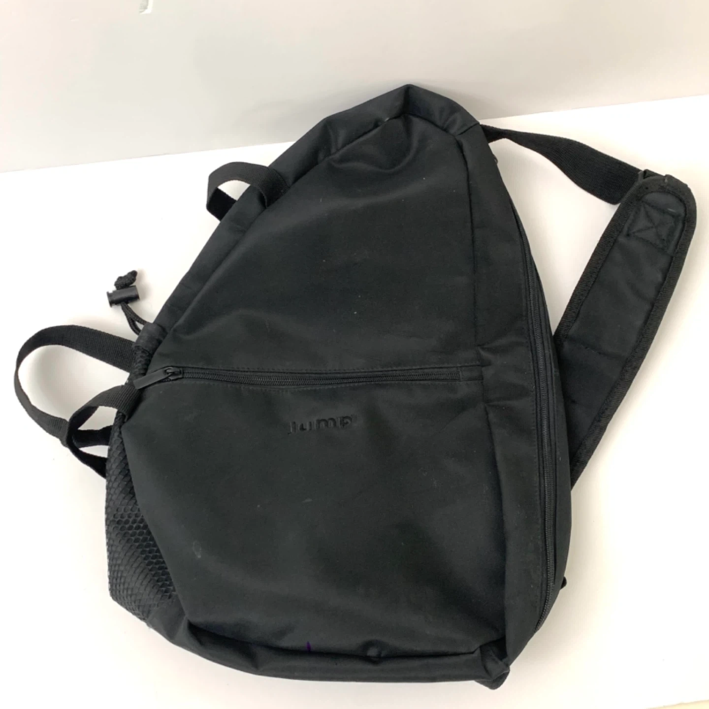 Sling backpack crossbody bag black nylon design perfect for travel, school, or everyday use. Lightweight with zippered main compartment, front pocket, and mesh side pocket for easy organization while staying comfortable on the go. Note: one zipper works but is missing the pull tag (see photos), priced accordingly.