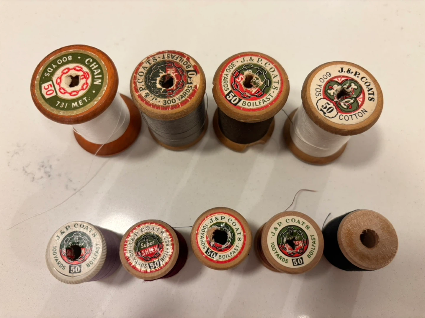 Nine wooden spools, all with original cotton thread still on them in varying amounts. Zoom into photos to see original labels, note some labels have fallen off.