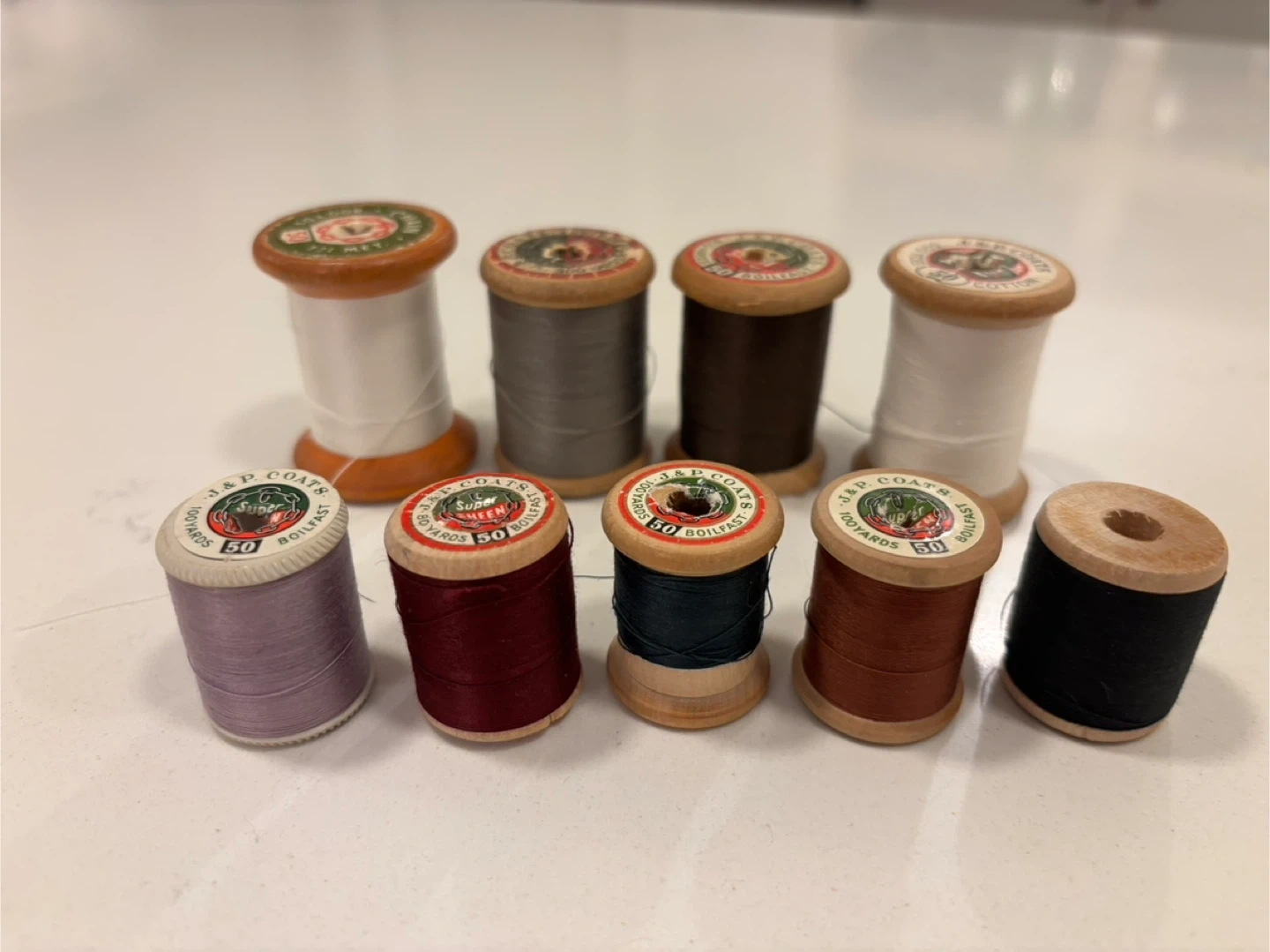 Nine wooden spools, all with original cotton thread still on them in varying amounts. Zoom into photos to see original labels, note some labels have fallen off.