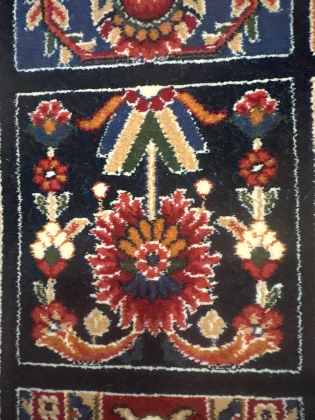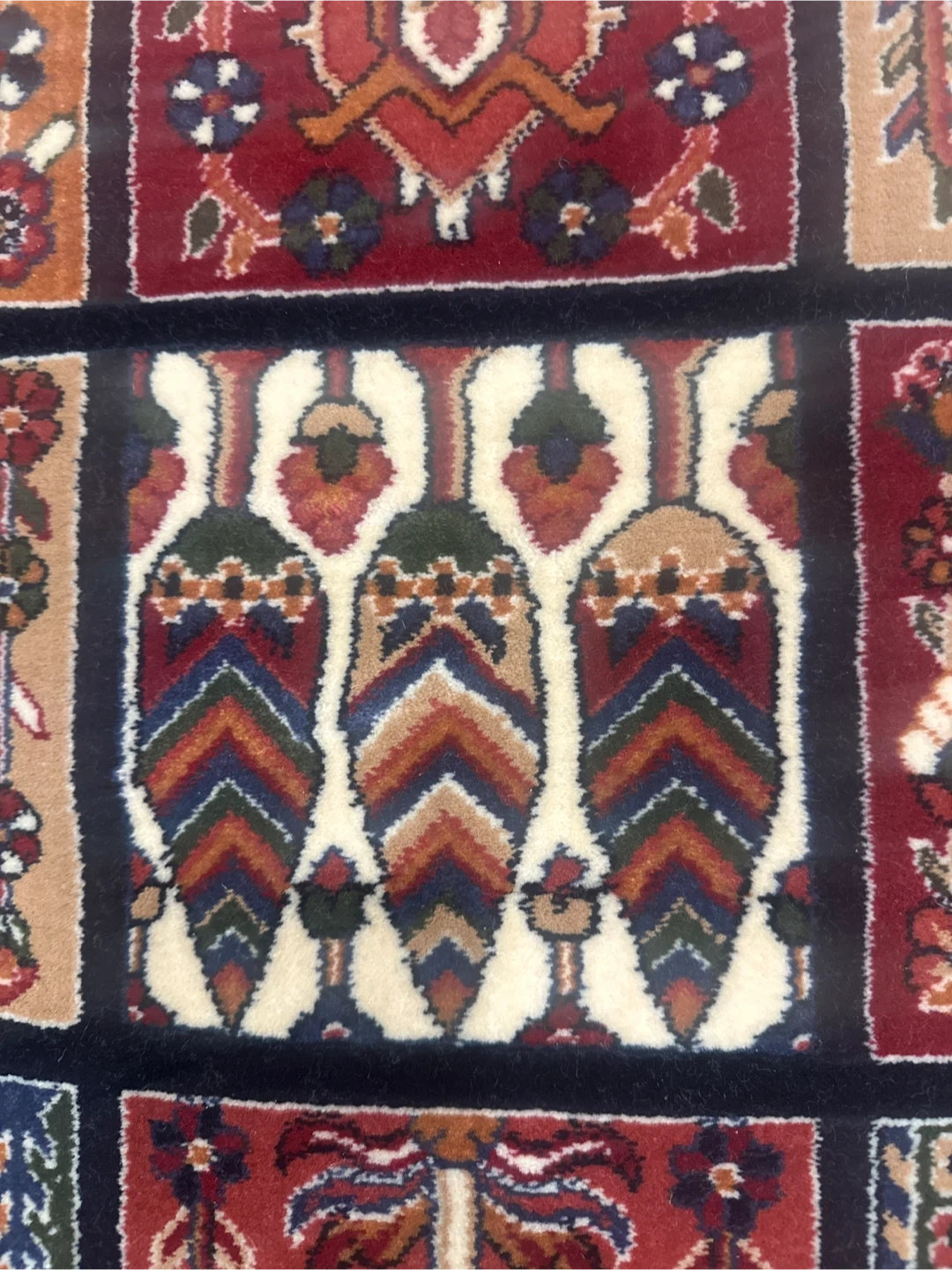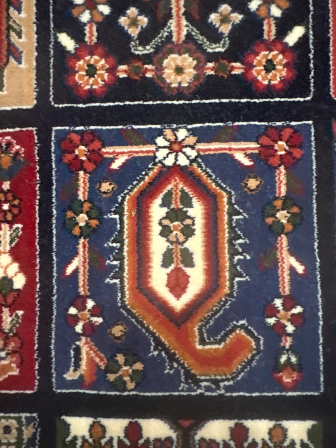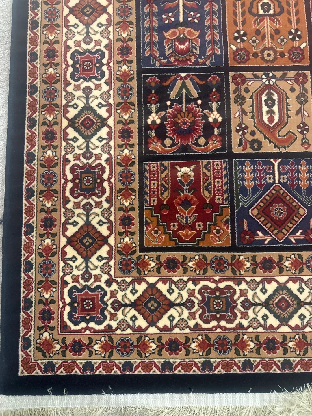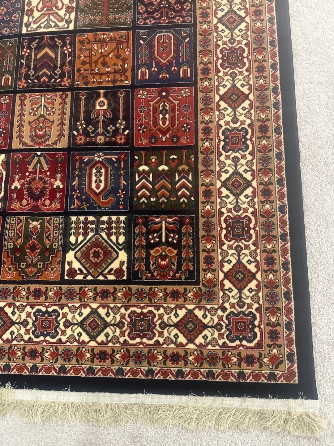 This beautiful luxury carpet features a detailed traditional pattern with squares of varying motifs. It has a fringe detail on both ends, and a decorative border. It's a lovely accent piece for any room! Reeds 700, Picks 2100. Made in Iran.