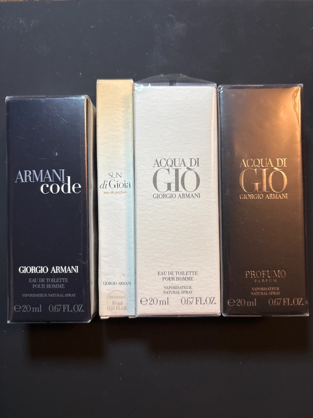 This lot includes three Giorgio Armani fragrances. Two are 20ml bottles of Acqua di Gio, one Eau de Toilette Pour Homme and one Profumo Parfum. There's also a 10ml bottle of Sun di Gioia Eau de Parfum. They're all new and in their original packaging.