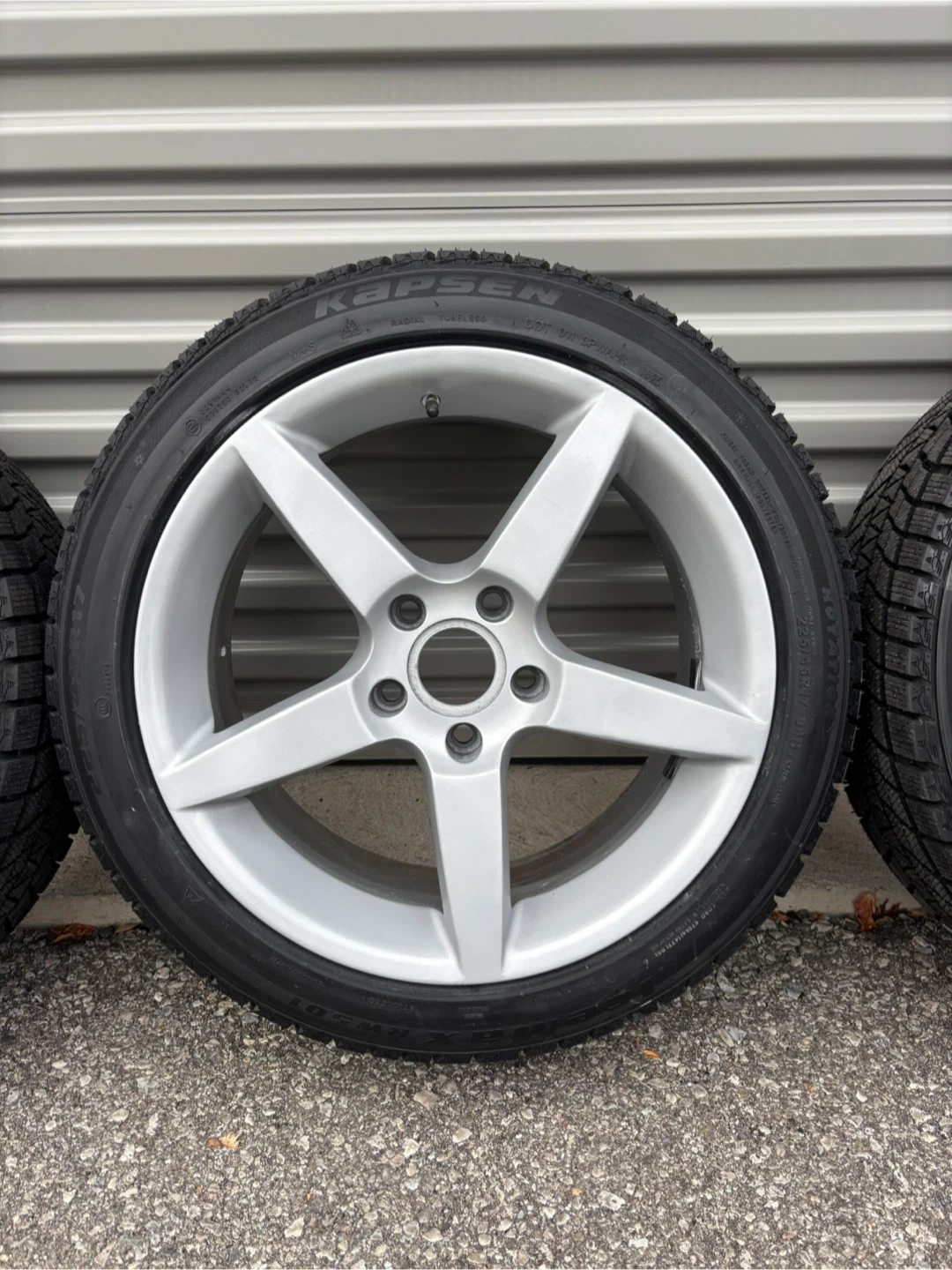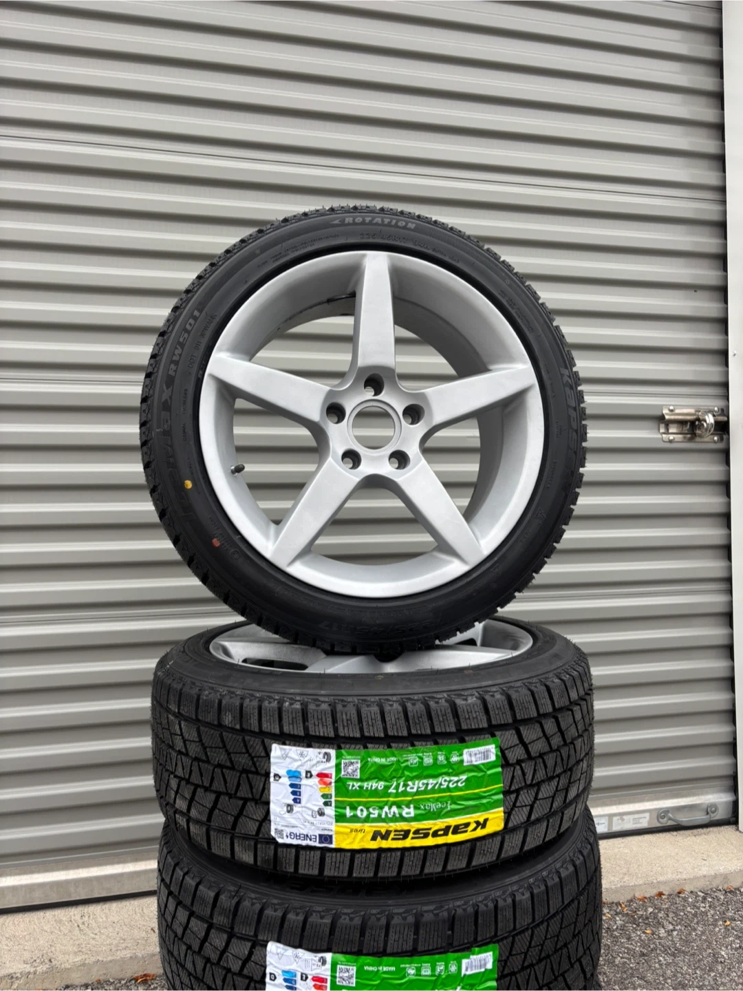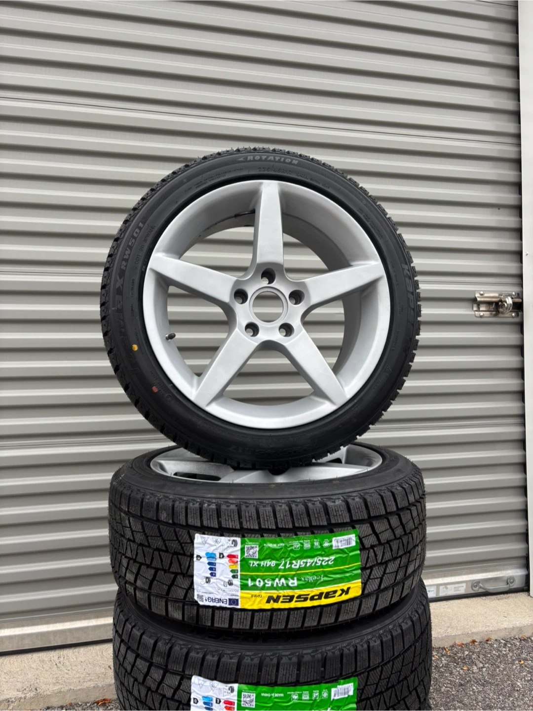 15Selling a set of 5x114.3 rims with new winter tires. 5x114.3 bolt pattern 76.2 hub bore 17x8 40 offset No bends or cracks, minor imperfections. Solid set of aftermarket wheels. 225/45/R17 kapsen icemax winter tires. Brand new 2025 DOT. Just mounted and balanced. No issues. Ready to be mounted to your vehicle! Serious buyers only, pickup only Kennedy and mayfield caledon.