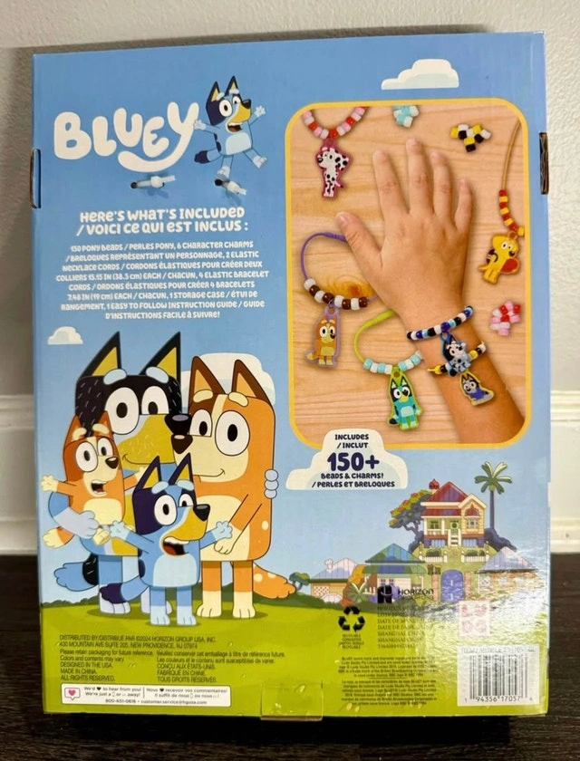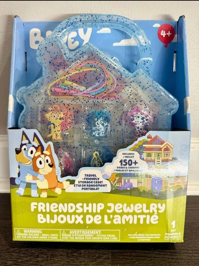 Create over 150 friendship bracelets and necklaces with this Bluey Friendship Jewelry set! This set includes beads, character charms, elastic cords and easy-to-follow instructions to make unique Bluey-themed jewelry. The travel-friendly storage case makes it easy to take your creations on the go. From pet and smoke free home Pick up at Creditview and Eglinton in Mississauga
