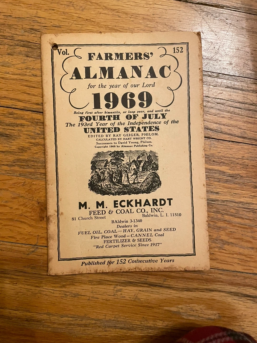 This is the 1969 Farmers' Almanac, the 193rd year of its publication in the United States. It was published by M. M. Eckhardt Feed & Coal Co., Inc. in Baldwin, L. I. This almanac contains information on planting and weather.