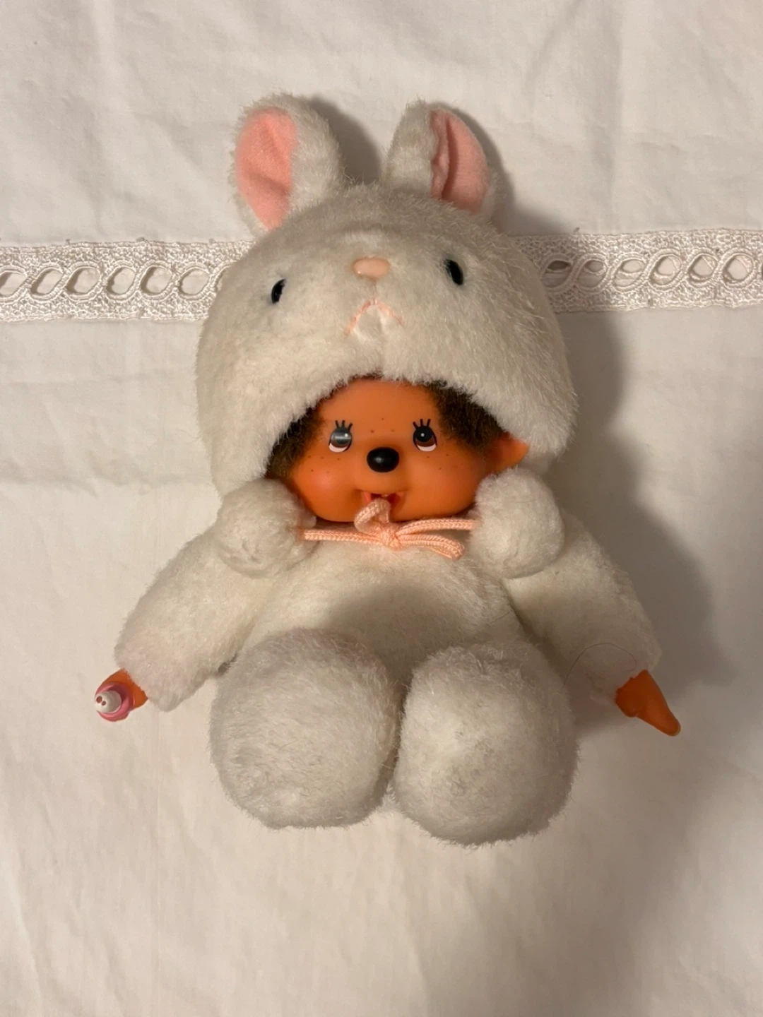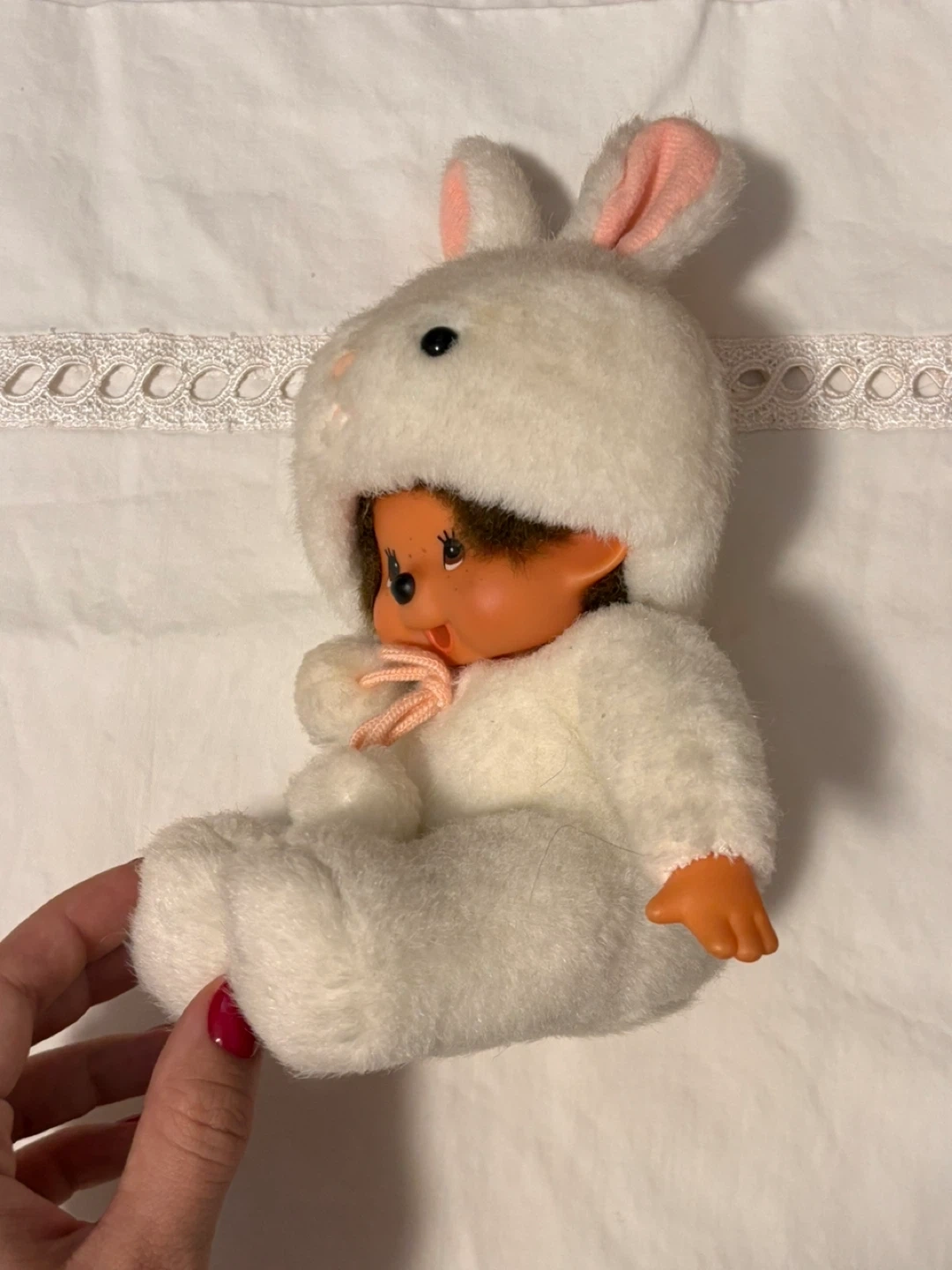 This is a classic Monchhichi doll dressed in a cozy white bunny costume. It's a cute collectible plush toy with its signature look. The doll comes with a bottle accessory.