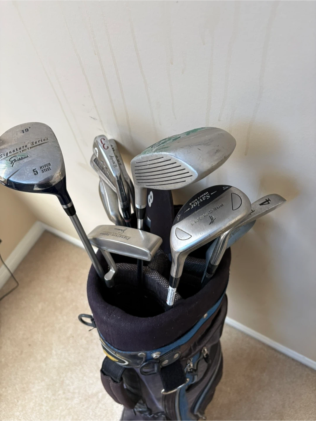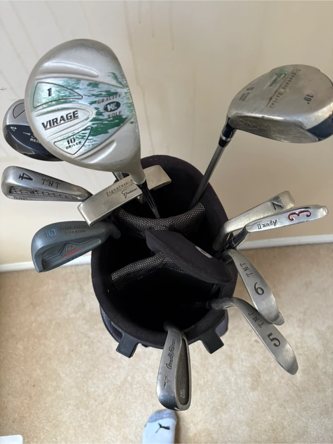 This is a full set of golf clubs, including a driver, irons, and a putter, all housed in a durable golf bag. Clubs feature various brands like Titleist, Virage, and TNT. It's a great set for a beginner golfer!