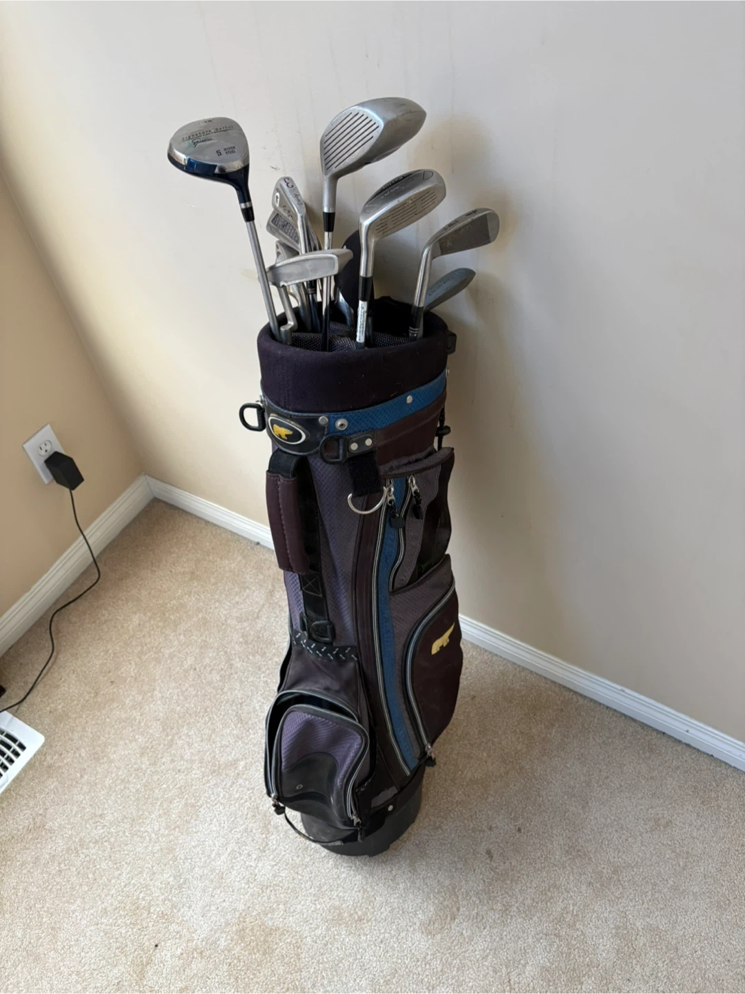 This is a full set of golf clubs, including a driver, irons, and a putter, all housed in a durable golf bag. Clubs feature various brands like Titleist, Virage, and TNT. It's a great set for a beginner golfer!