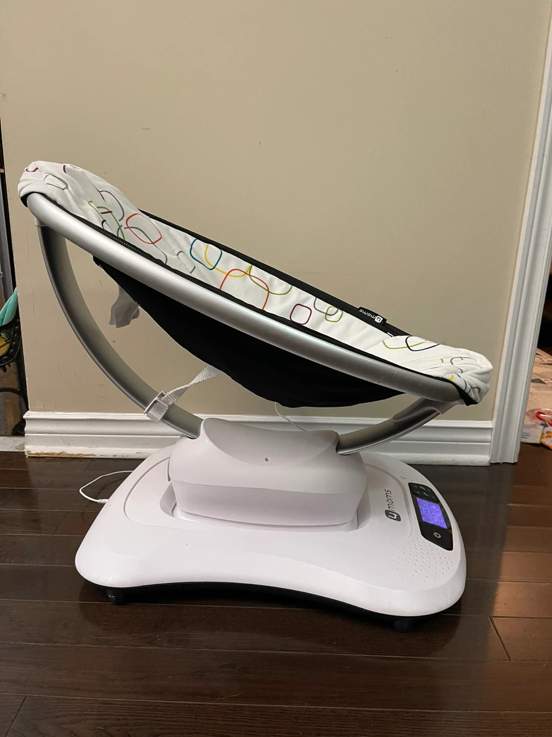 This is a 4moms MamaRoo baby swing with a white seat featuring a colorful block pattern. It has multiple motion settings and Bluetooth connectivity for music. It's perfect for soothing your little one!