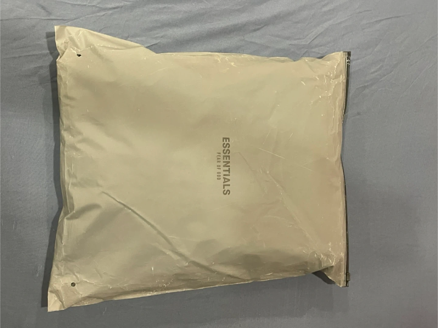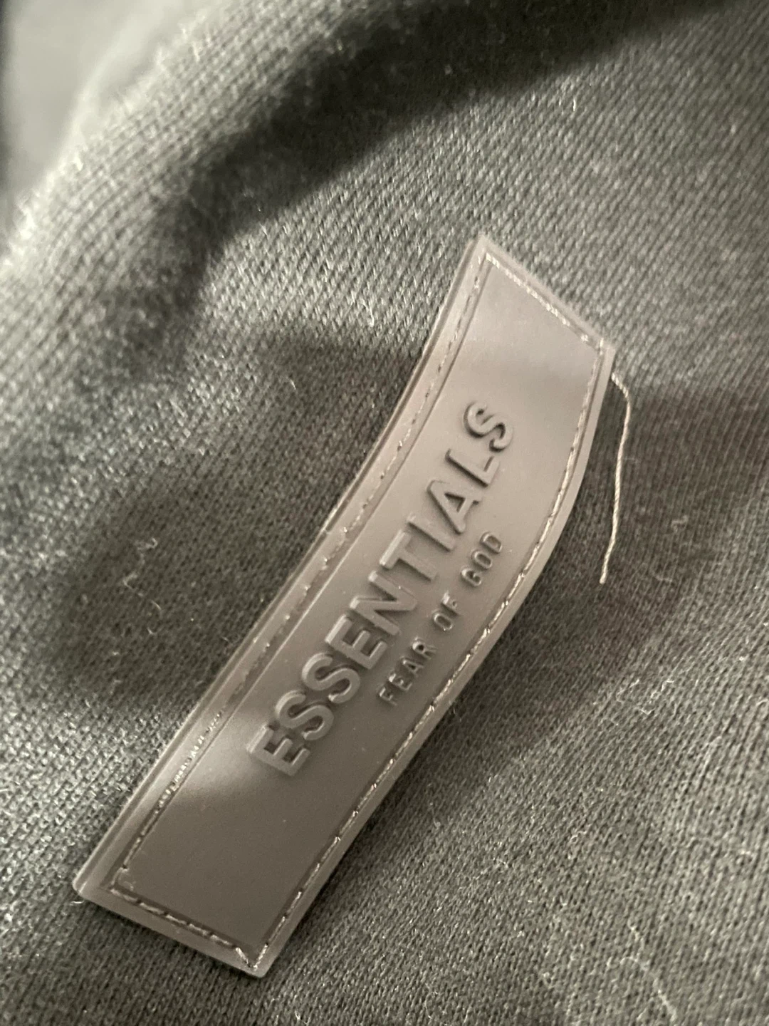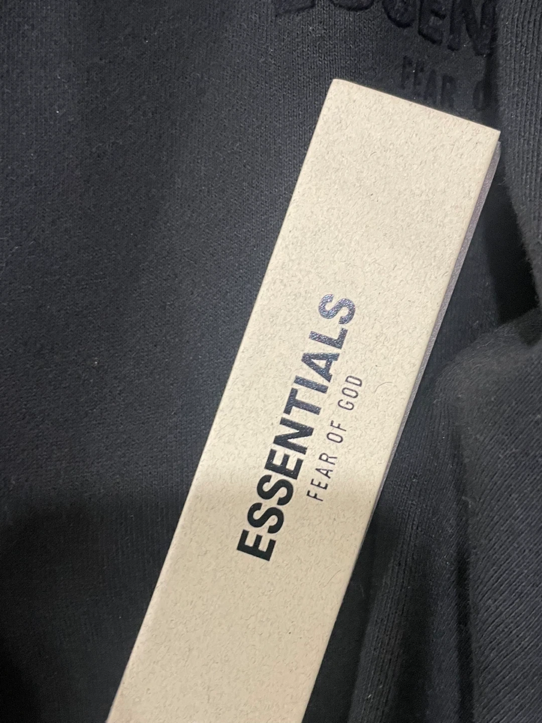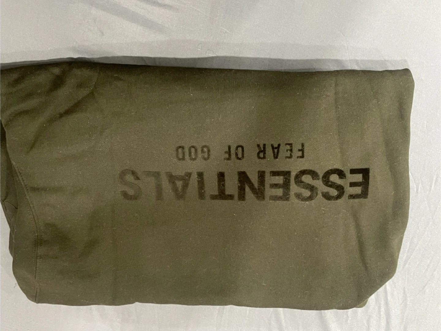 This is a Fear of God Essentials hoodie in size Medium. It's made of 80% cotton and 20% polyester. This pullover hoodie has a classic design with a front pouch pocket and a drawstring hood. It's a comfortable piece for everyday wear.
