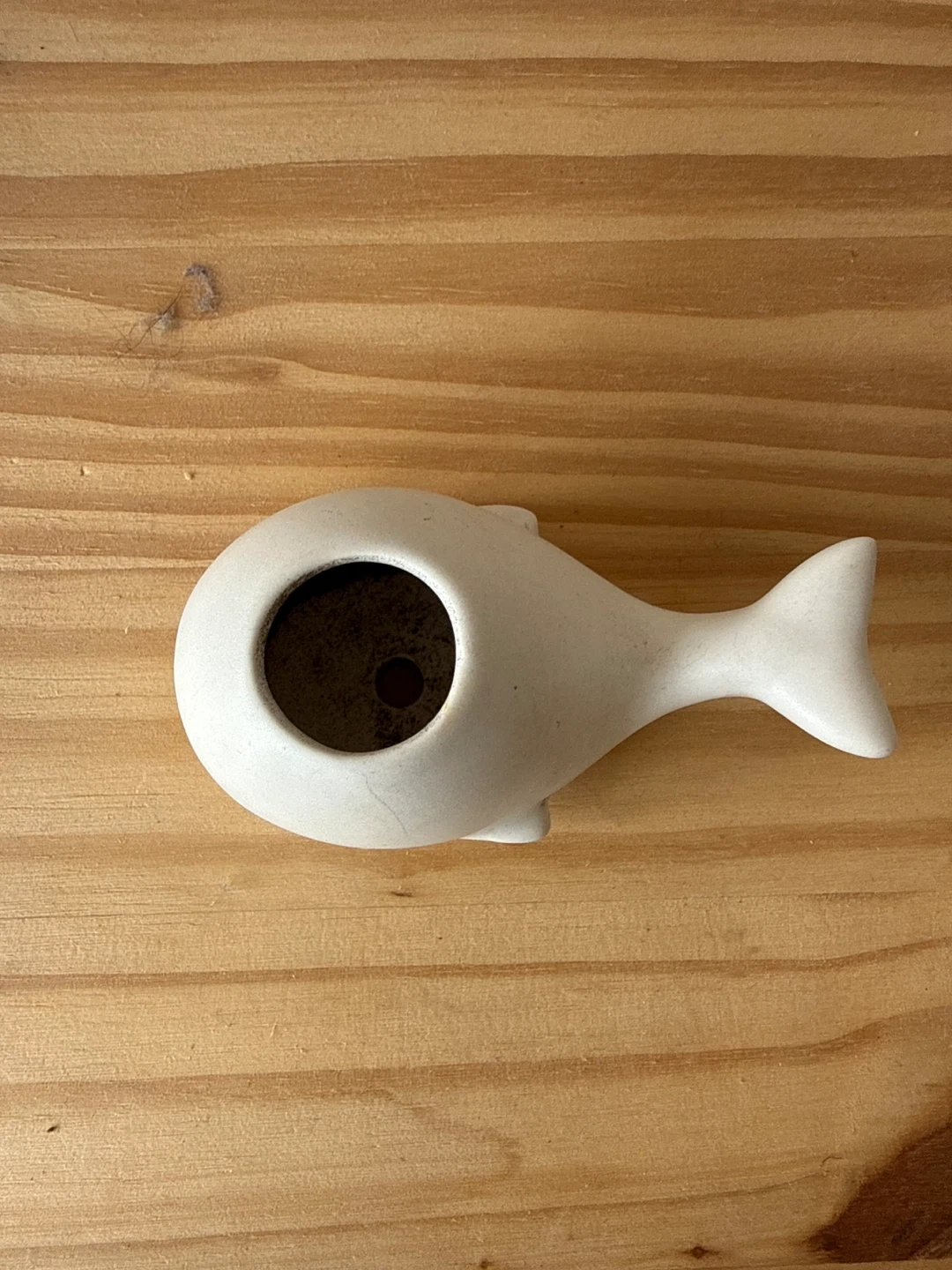 Cute ceramic whale planter. Small opening at the top for a plant or to hold small items. White matte finish.