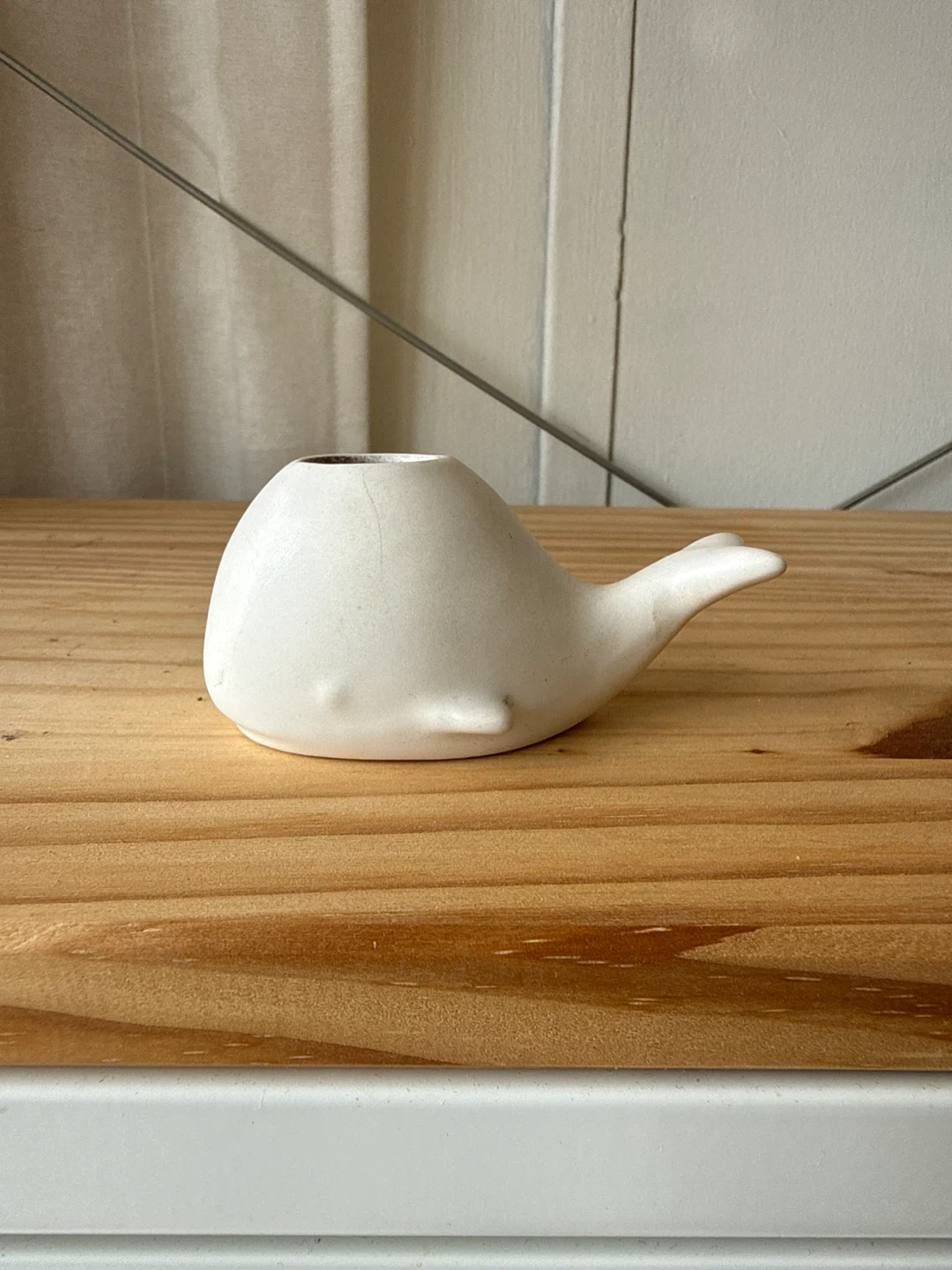 Cute ceramic whale planter. Small opening at the top for a plant or to hold small items. White matte finish.