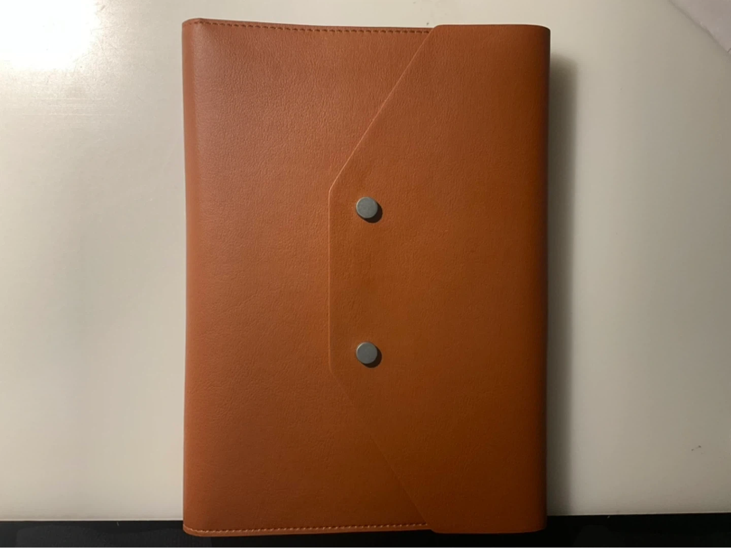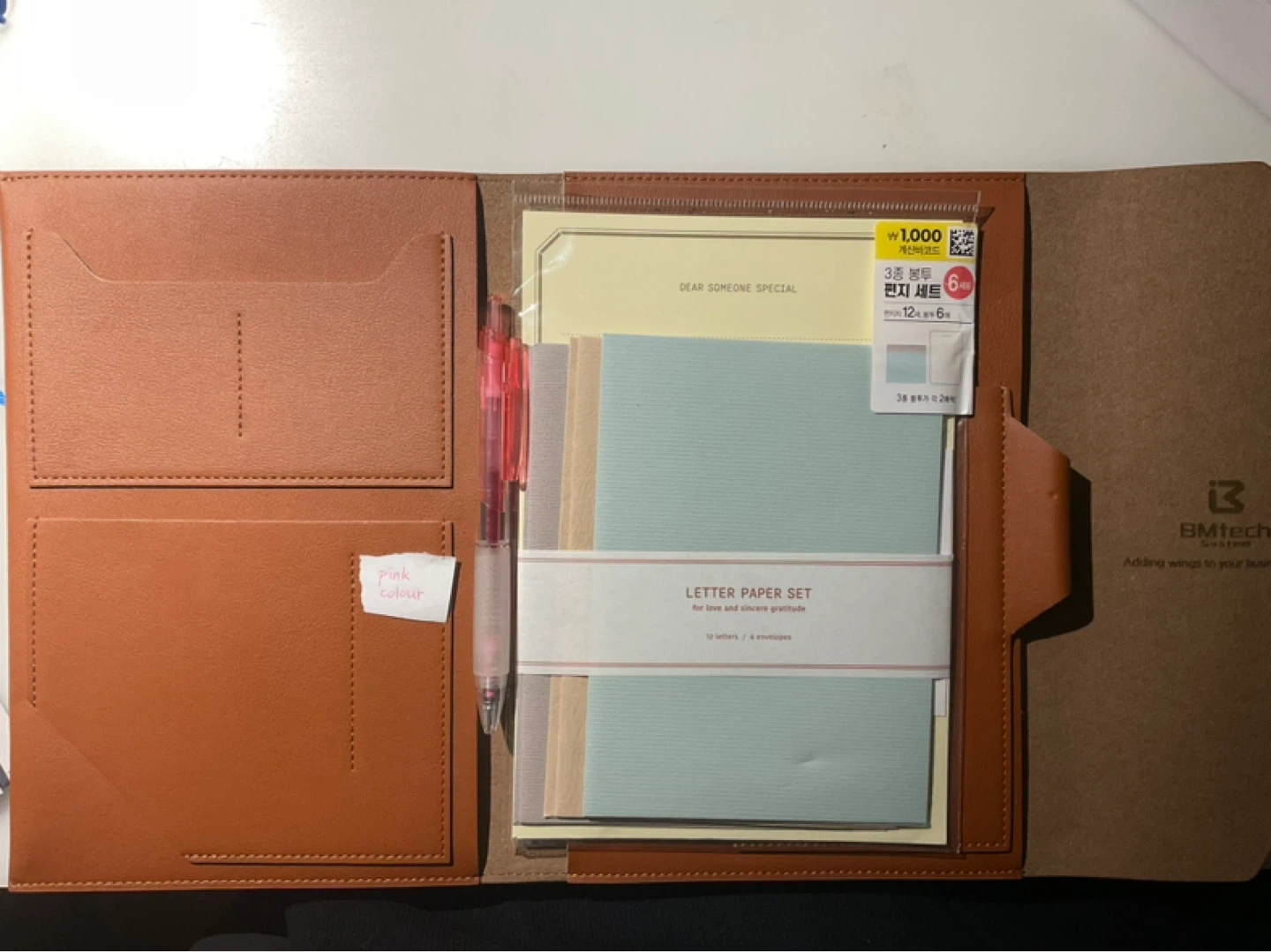 This is a BMtech letter paper set that includes 12 sheets of paper and 6 envelopes. The set comes in a nice brown folio case with pockets. A pink pen is also included.