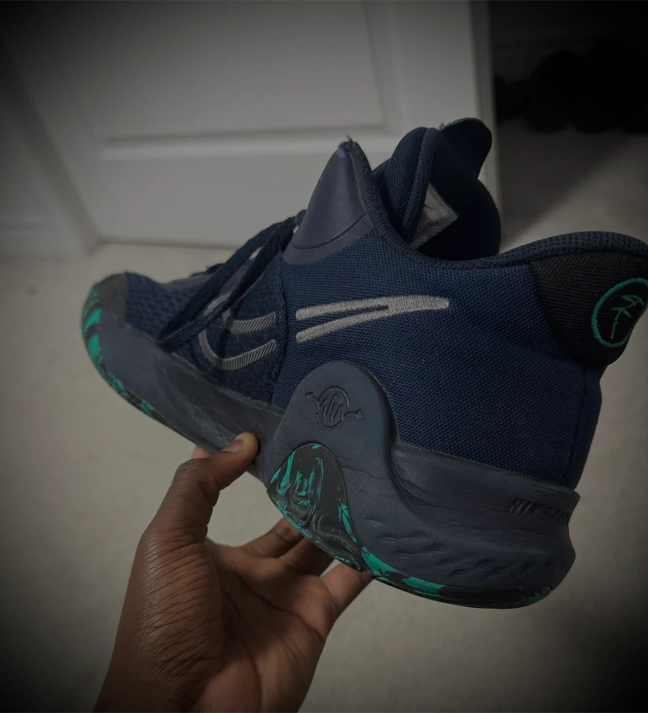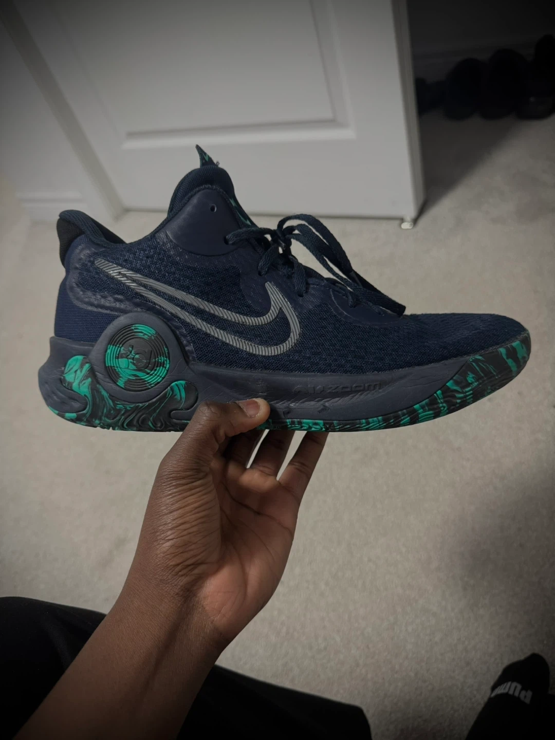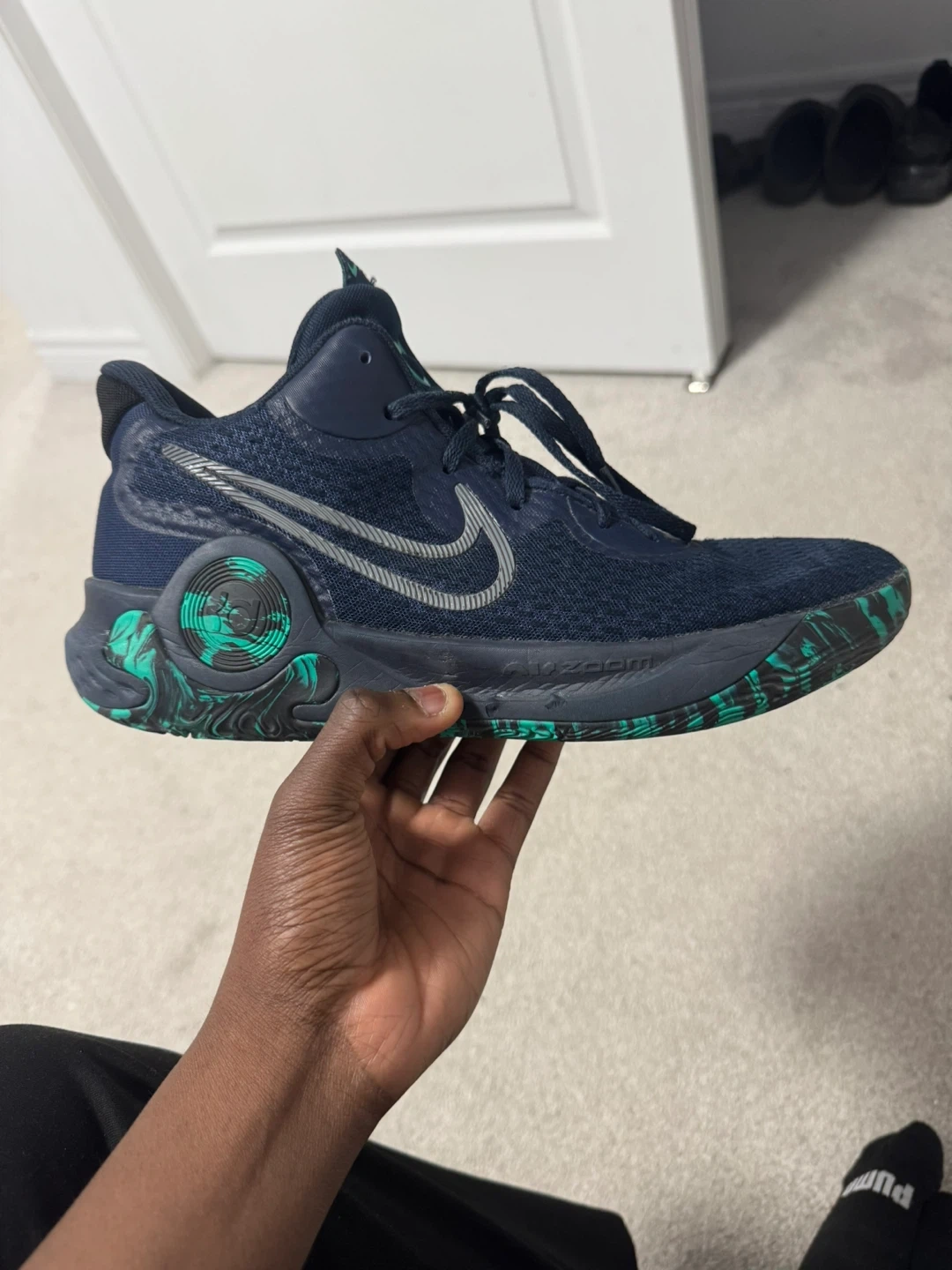 Nike KD 15 basketball shoes in navy and green. Size US 10.5. These shoes offer great performance and style for the court. They're built for comfort and support during games and practices.