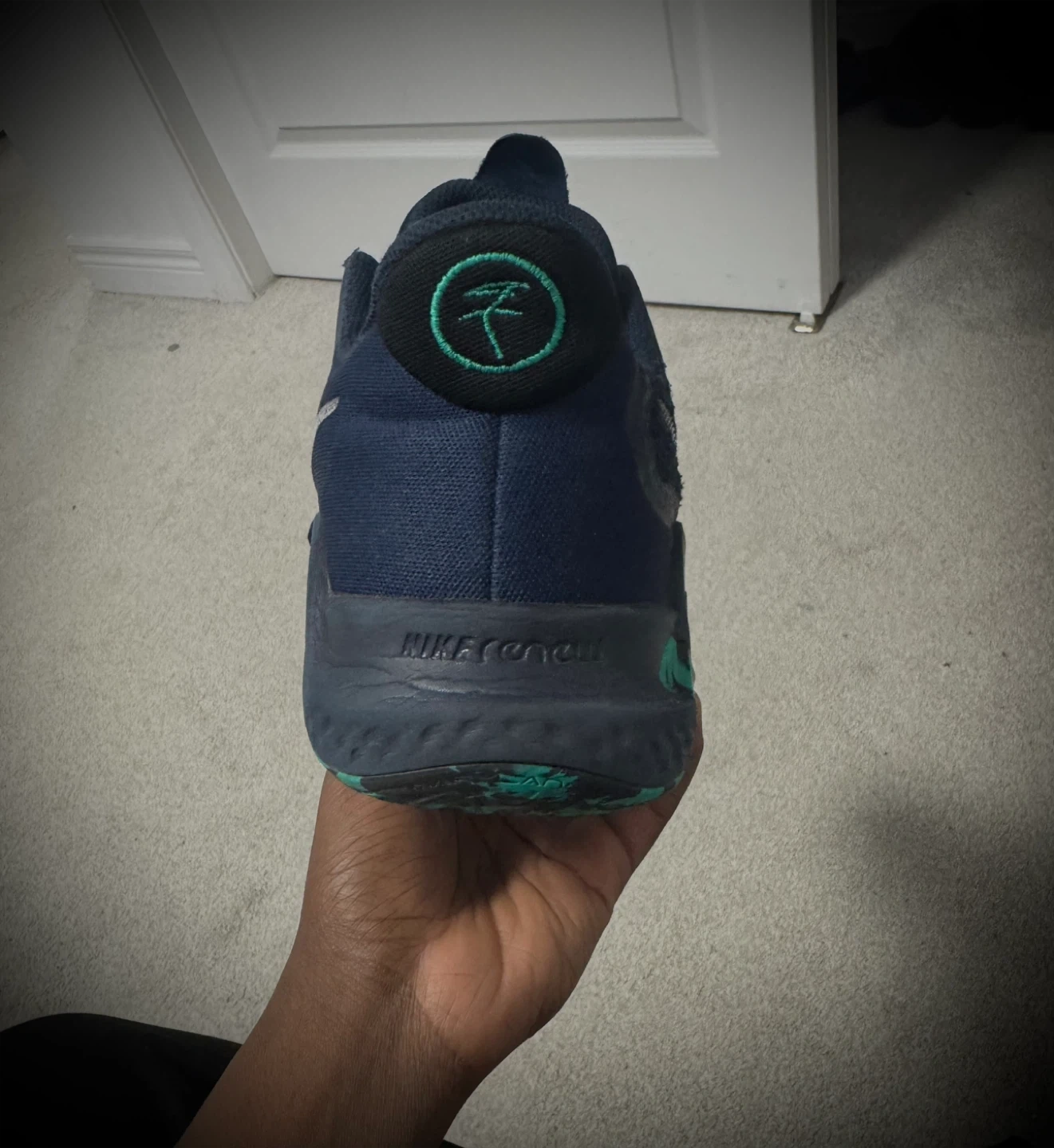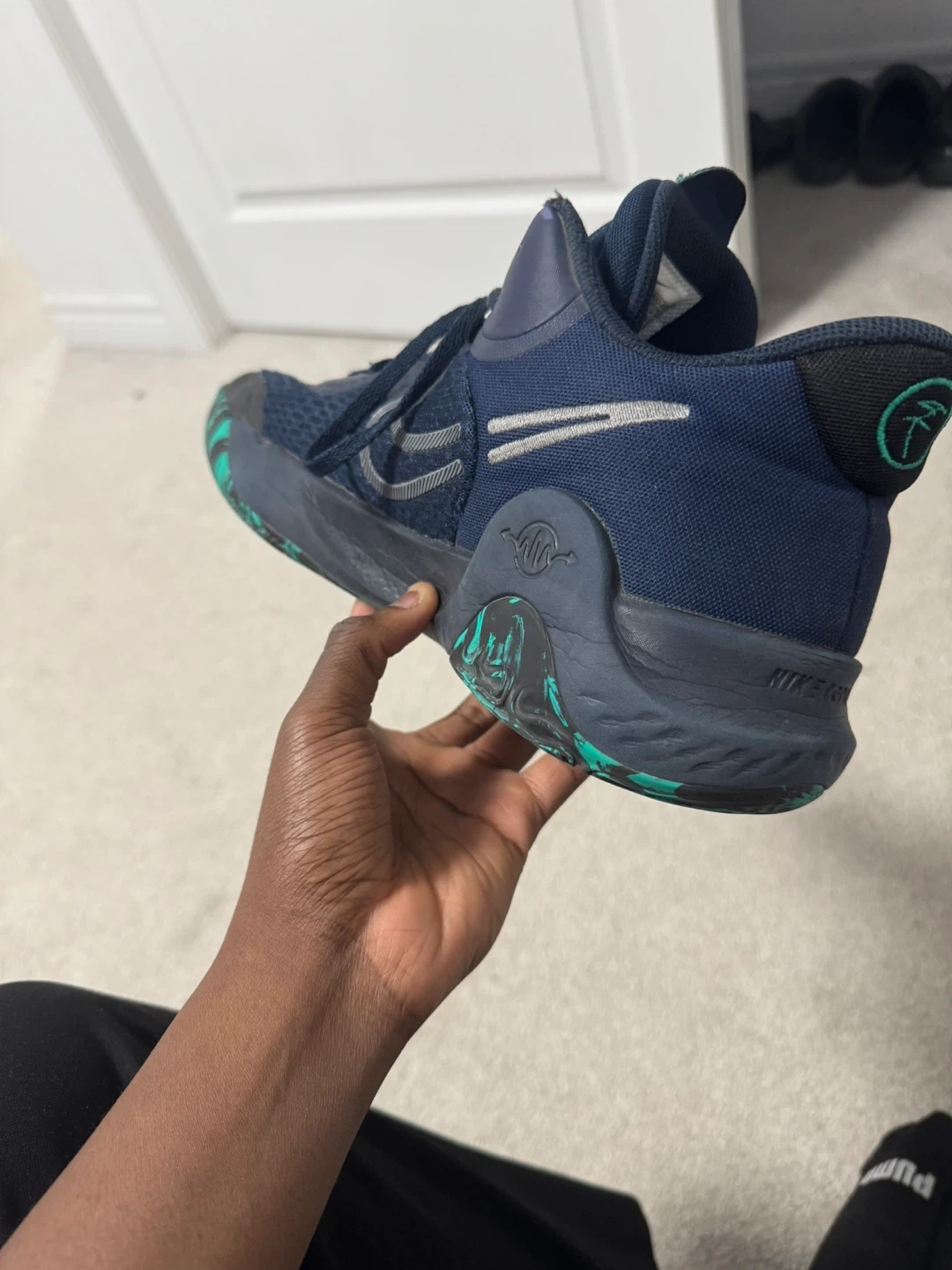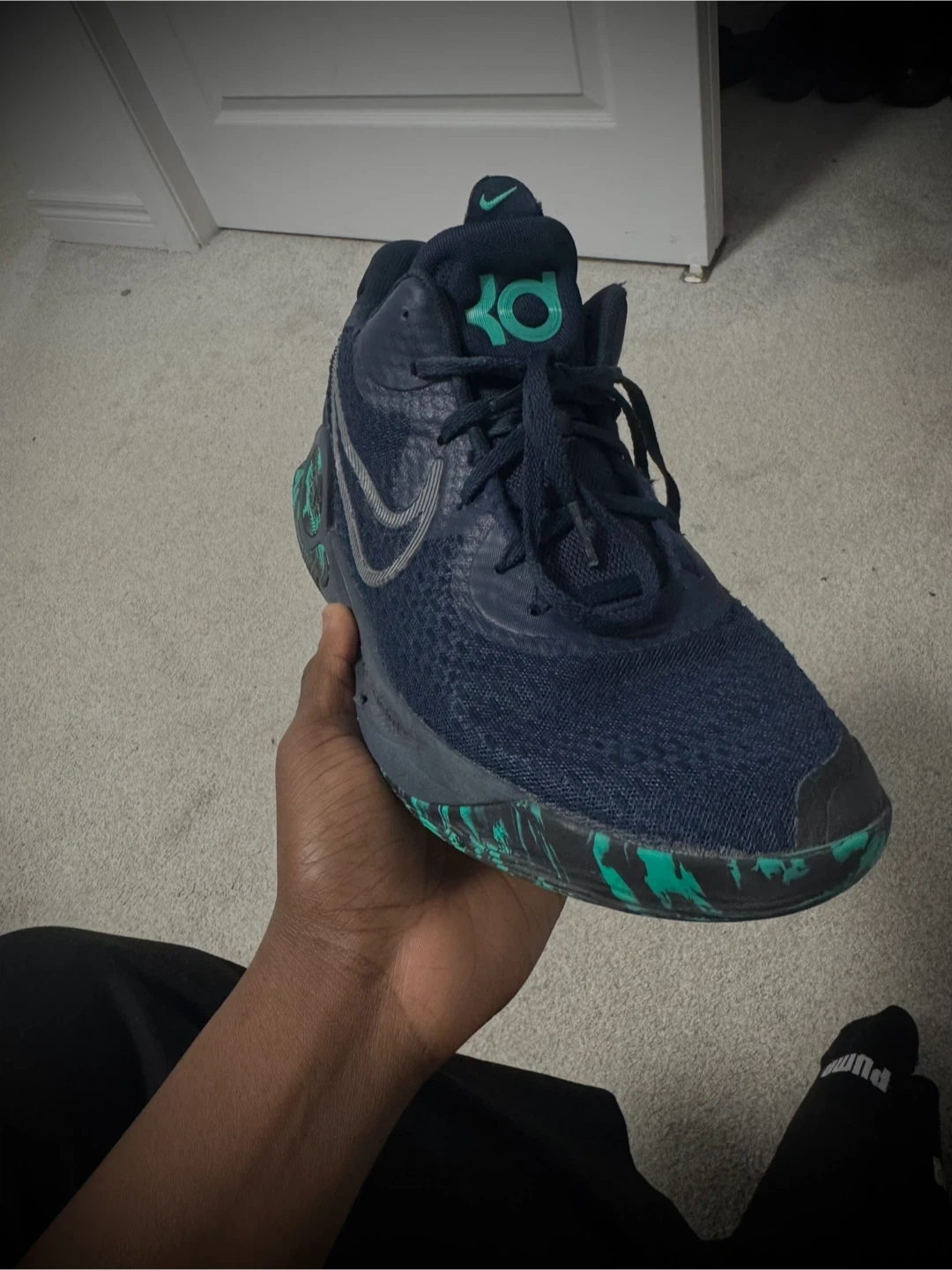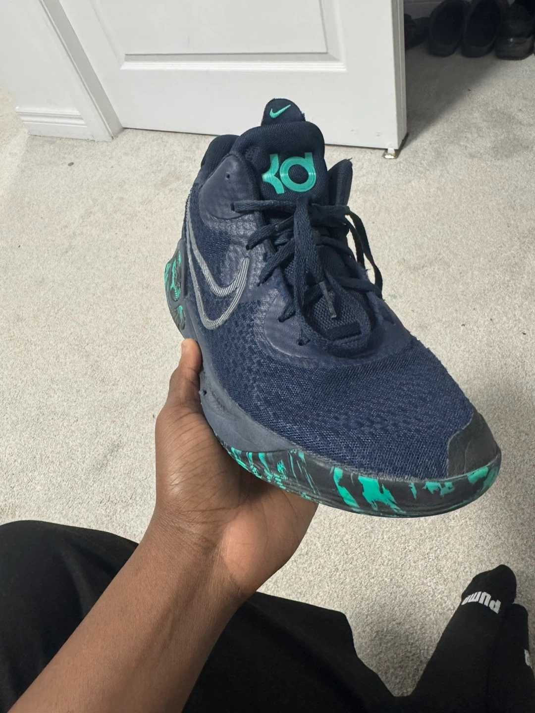 Nike KD 15 basketball shoes in navy and green. Size US 10.5. These shoes offer great performance and style for the court. They're built for comfort and support during games and practices.