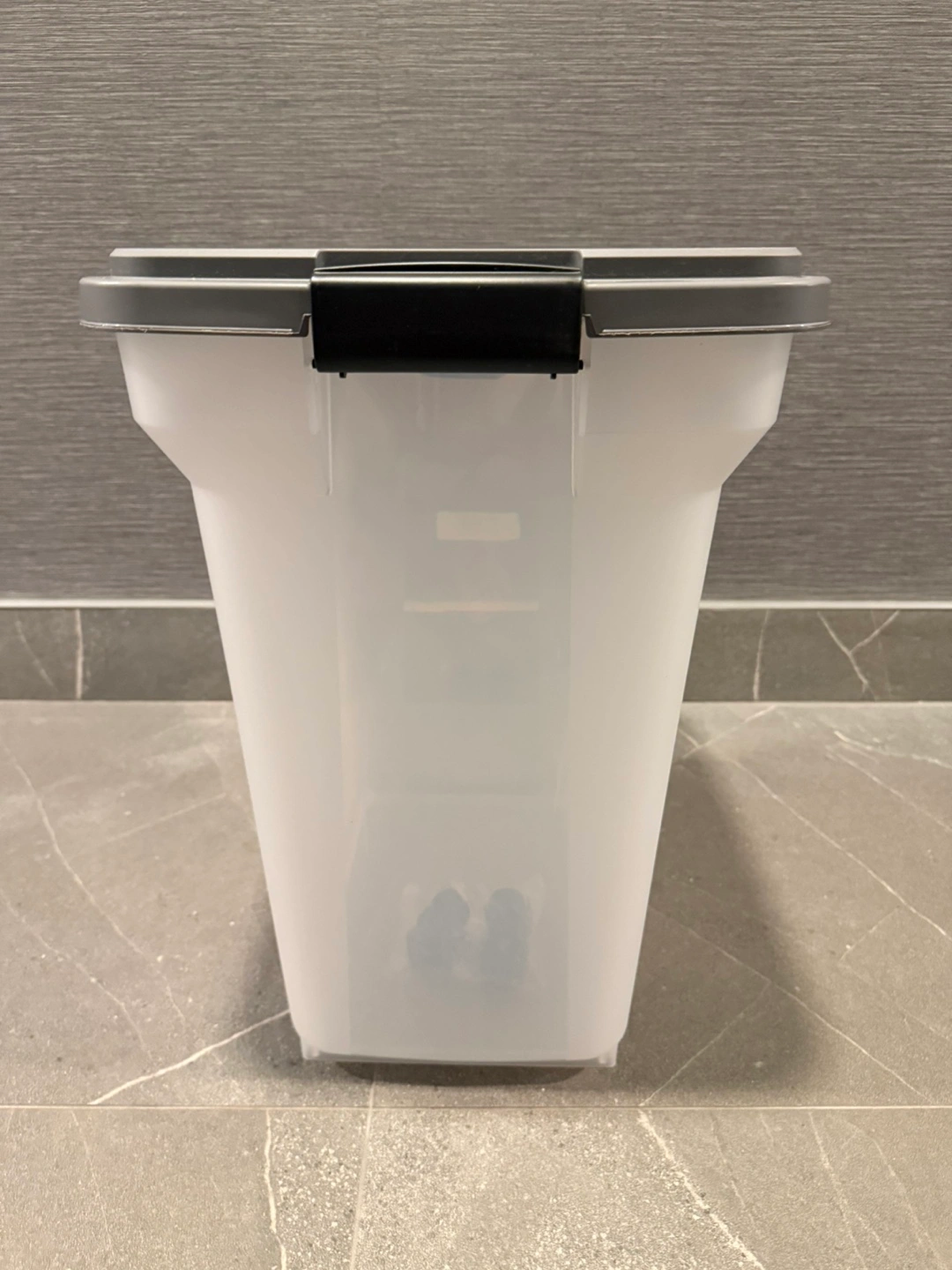Clear with a gray lid and black accents