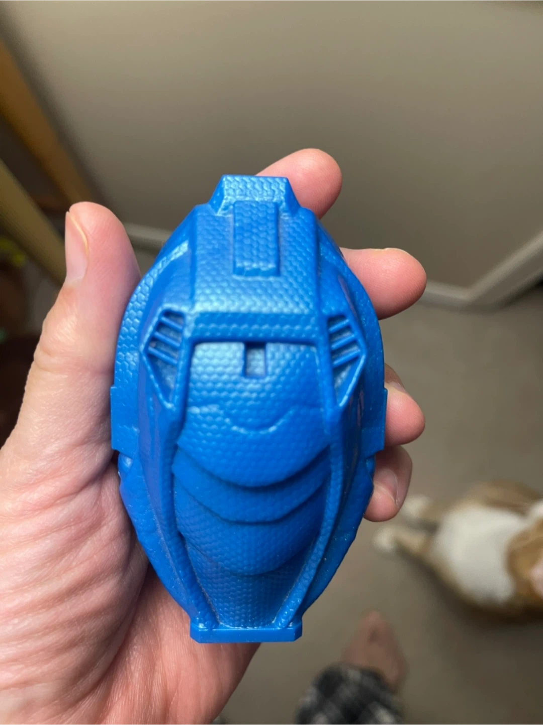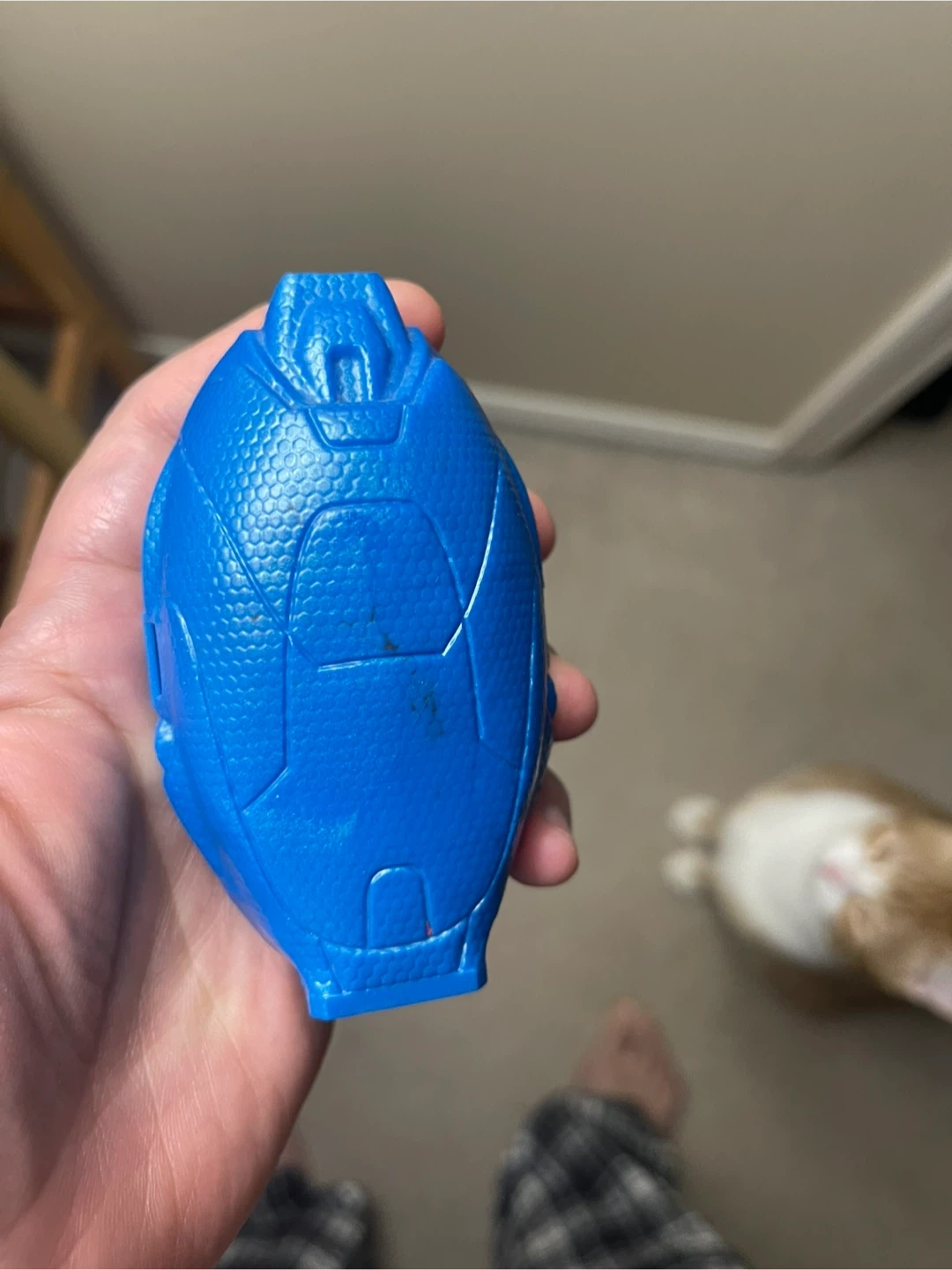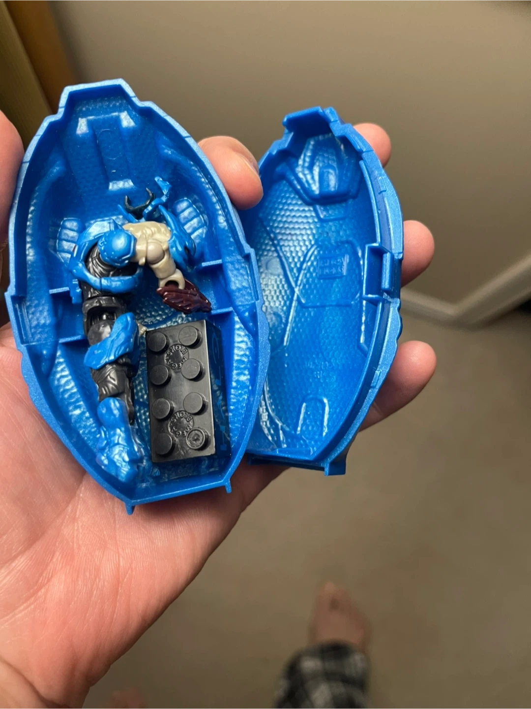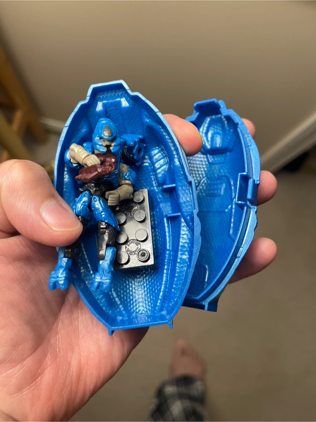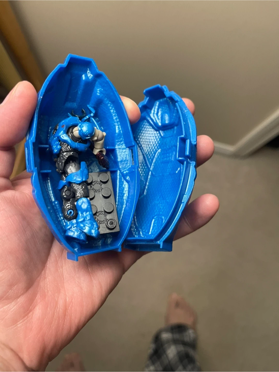 This is a Mega Construx Halo blind bag with a blue Spartan figure inside. The capsule opens to reveal the figure and a small brick base. It's a fun collectible for Halo fans!