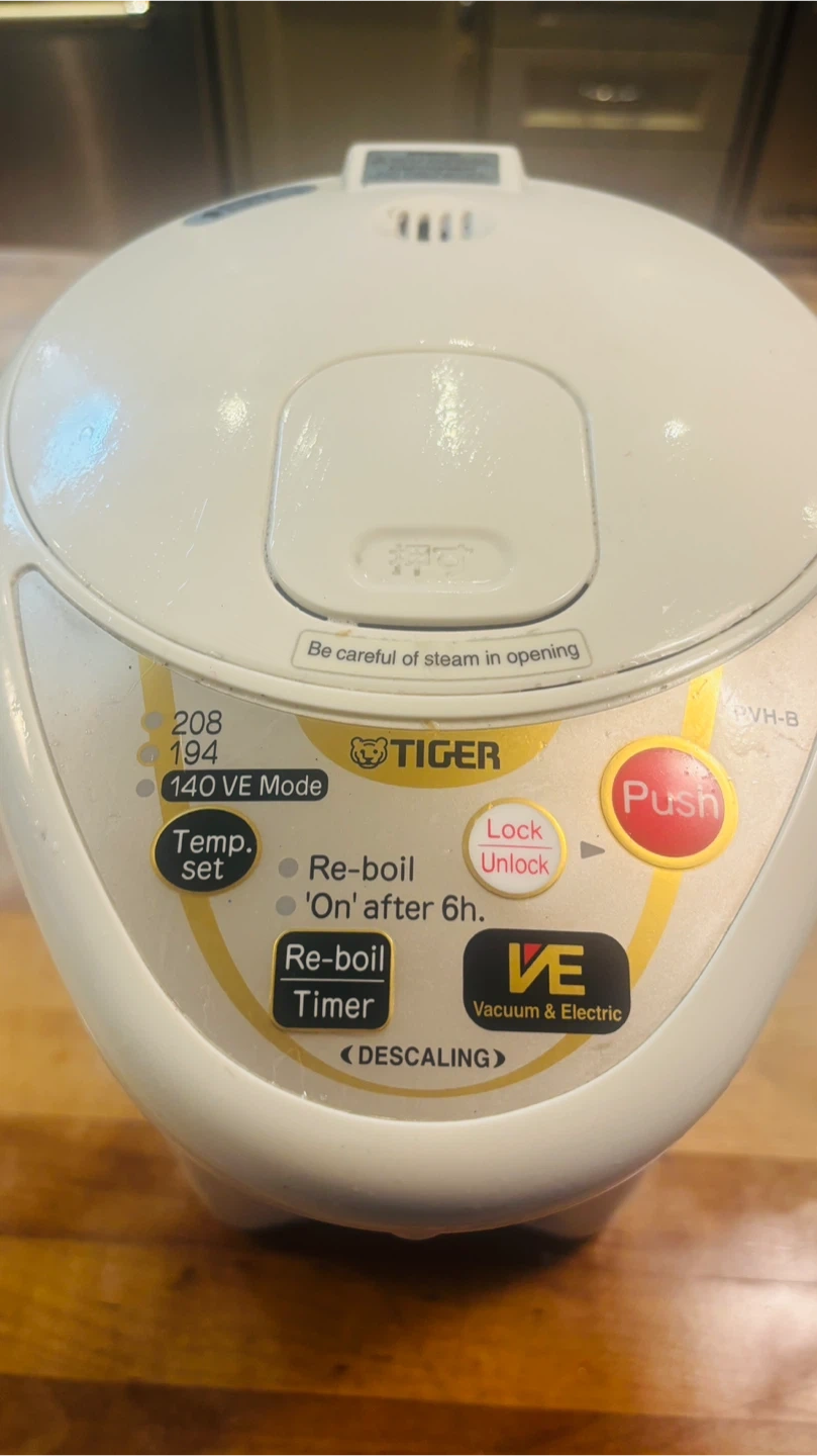 Tiger electric water boiler with a 3.0L capacity. It features programmable temperature settings at 208, 194, and 140°F, along with a re-boil timer. This appliance also has a VE Vacuum & Electric mode. It's handy for keeping water at your preferred temperature throughout the day!