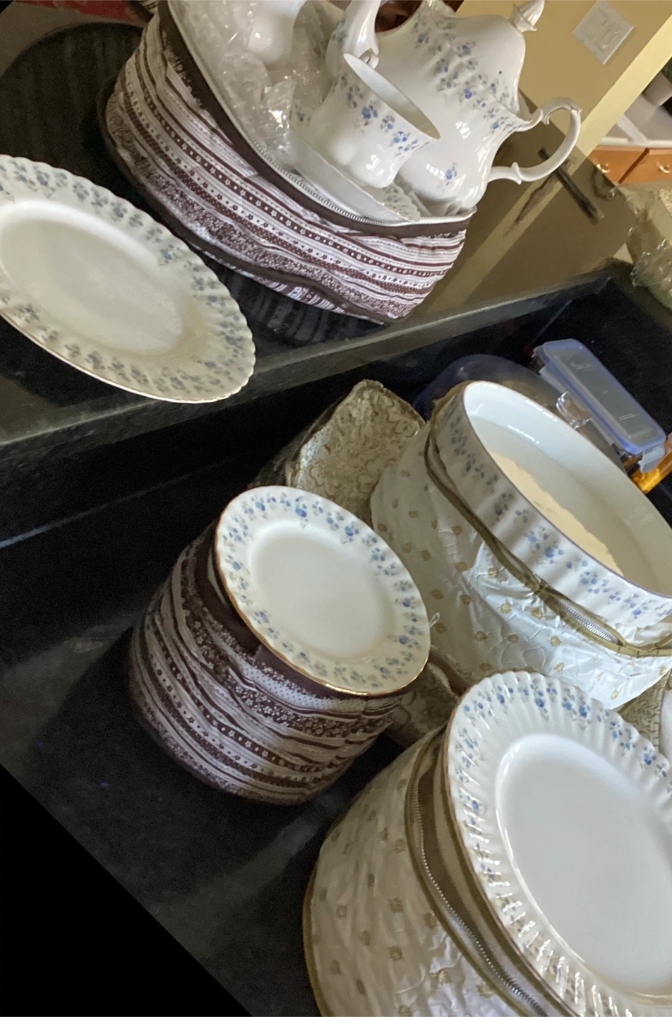 A beautiful Royal Albert tea set featuring a delicate blue floral pattern on white china. It includes a teapot, cups, and saucers, all neatly stored in patterned cases. The set also comes with several plates for a complete service. It's perfect for those who enjoy hosting tea parties or collecting antique dinnerware.
