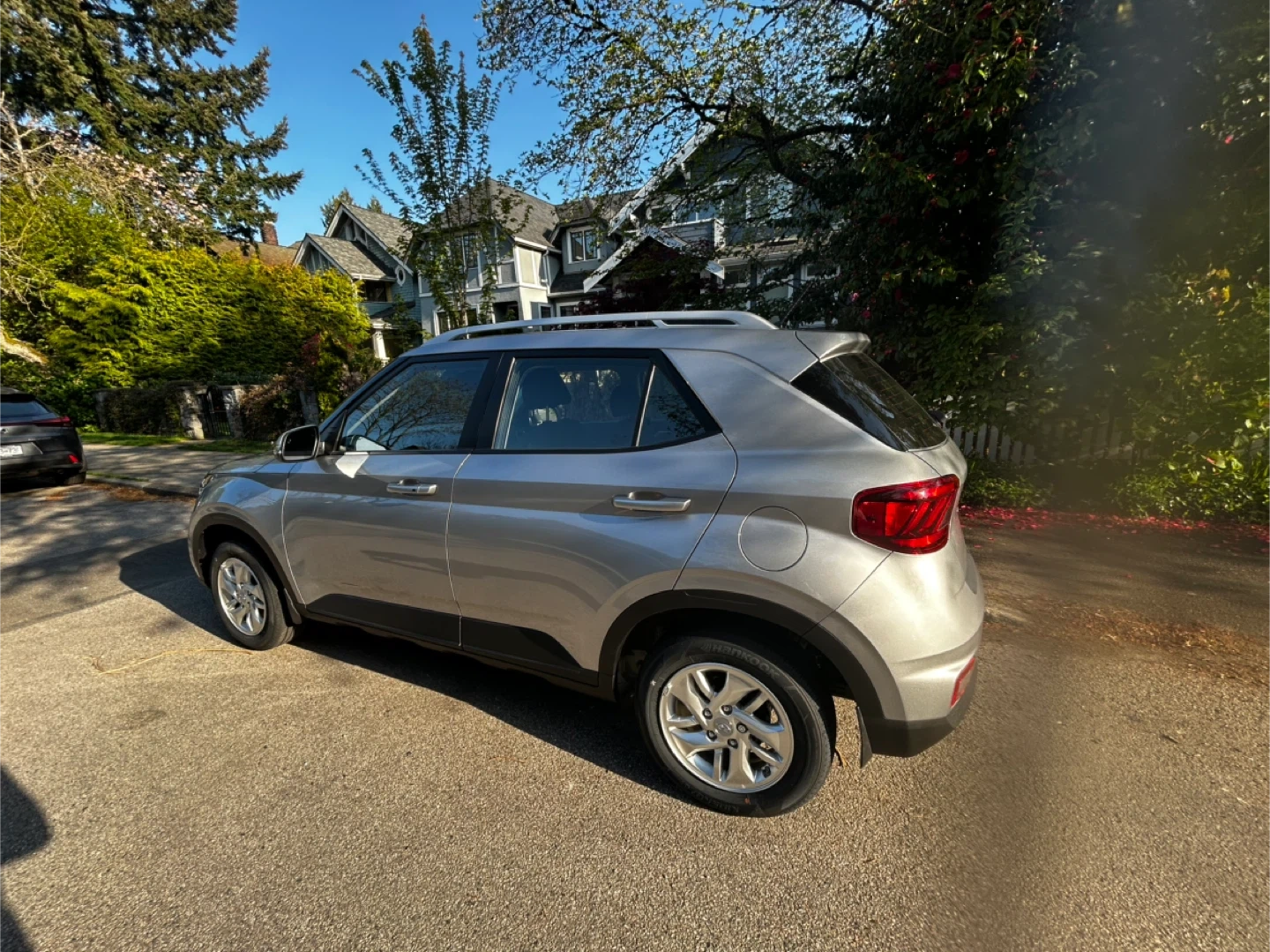 Silver Hyundai Venue SUV. It's a 2025 model with 10,505 km on it. This vehicle is practically new and has a roof rack. Great for city driving! Very good on gas. I moved closer to work so no need for car anymore.