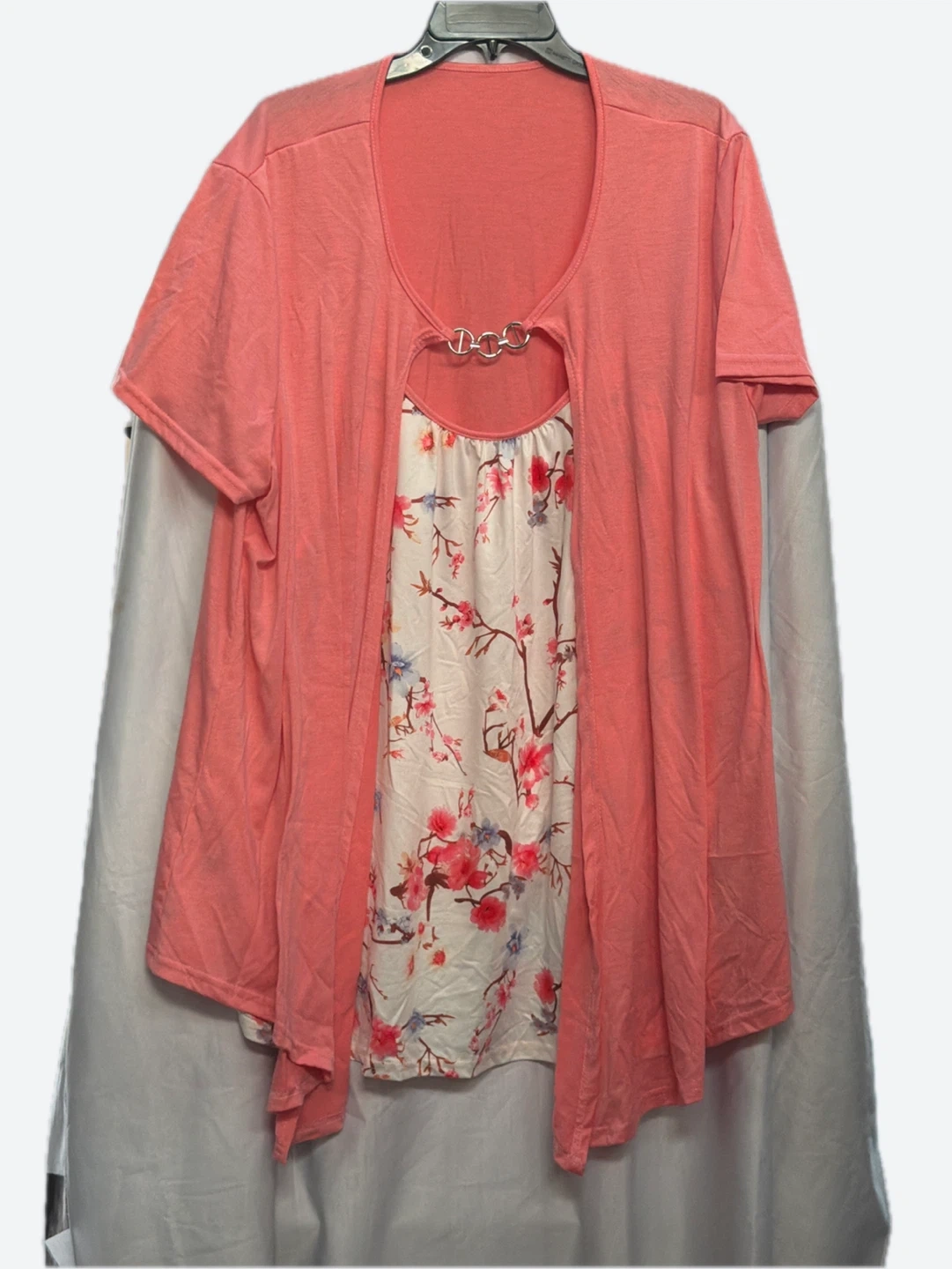 This layered top features a solid coral outer layer with short sleeves and a printed white underlayer with a floral design. It's accented with three silver-tone rings at the neckline. A comfortable and stylish addition to your wardrobe!