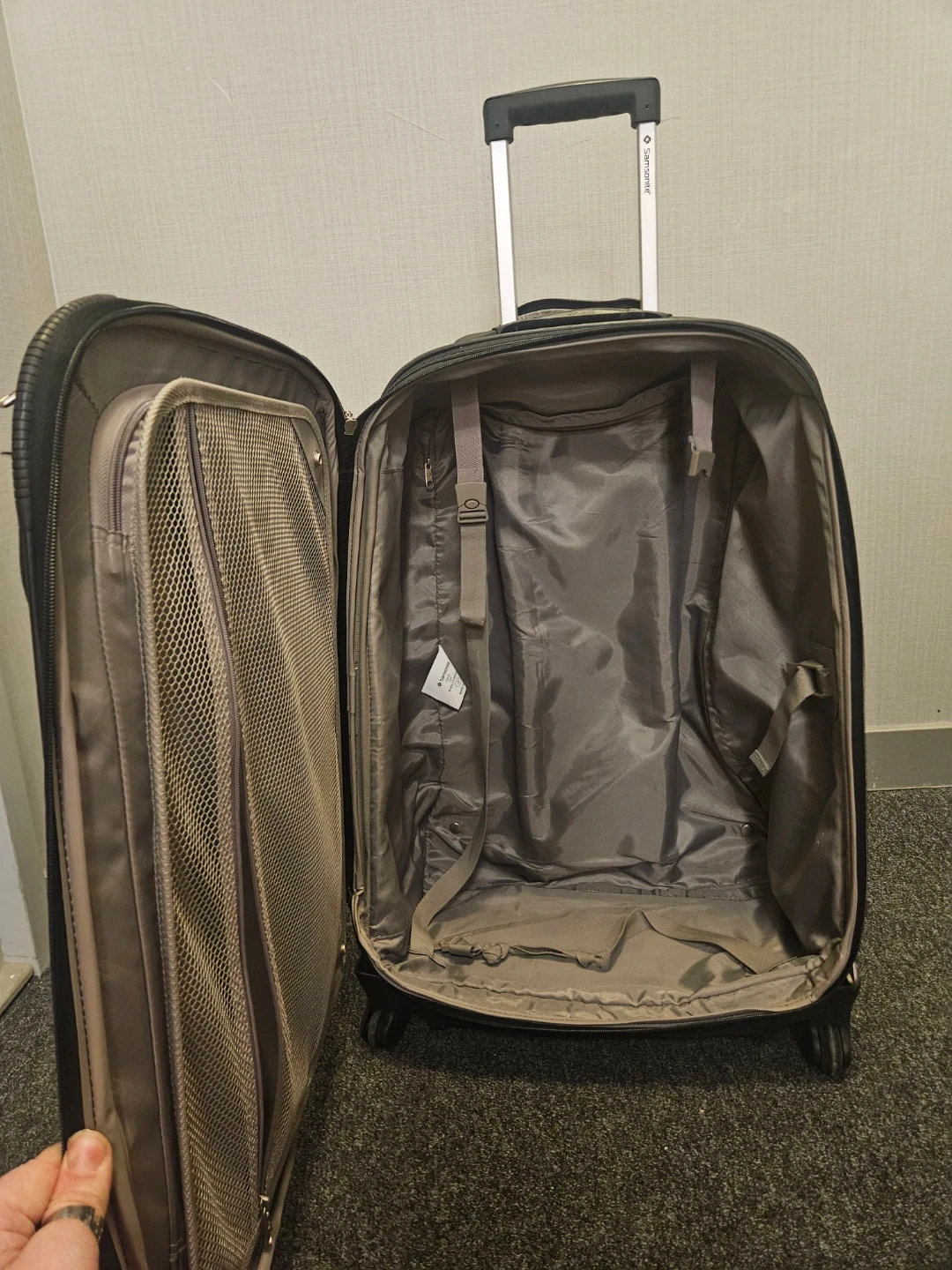 This is a Samsonite Expandable rolling suitcase from the Mobility Series. It's black and has a telescopic handle with 4, 360 wheels for easy transport. The interior is spacious with tie-down straps.