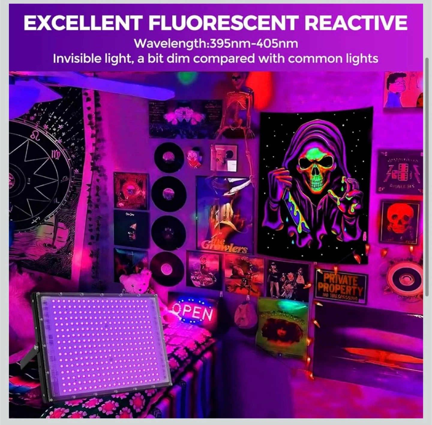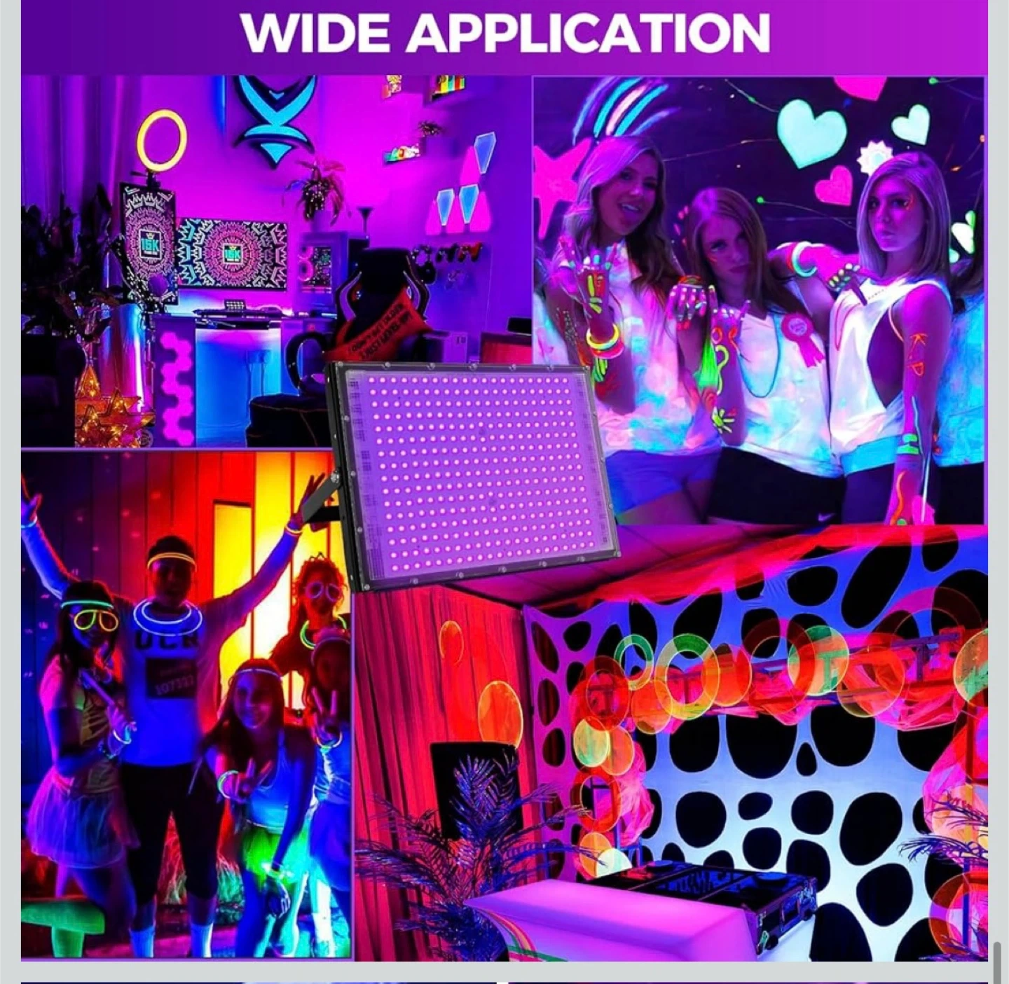 Powerful LED black light flood light with dimensions of 34.5cm x 25cm. It features a wavelength of 395-405nm and has a better heat dissipation design. Suitable for parties, fluorescent reactive displays, and stage lighting.