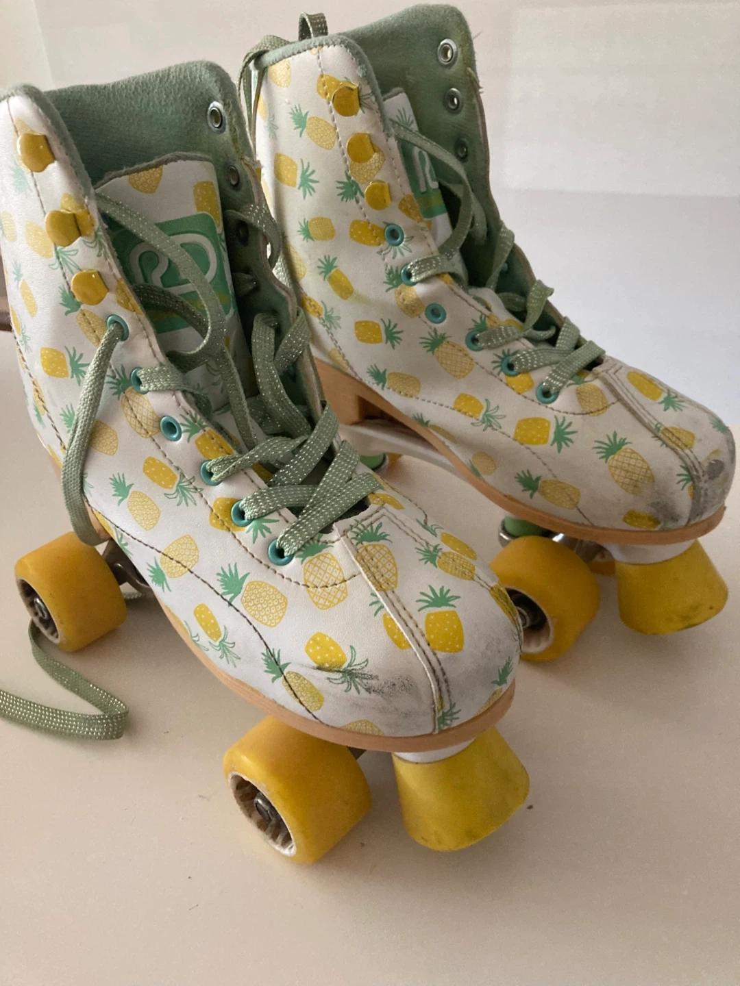 These roller skates feature a fun pineapple pattern and mint green accents. They have yellow wheels and laces. They're ready for some cruising. Adjustable, fits girls size 3-6.