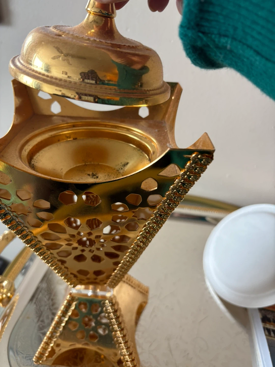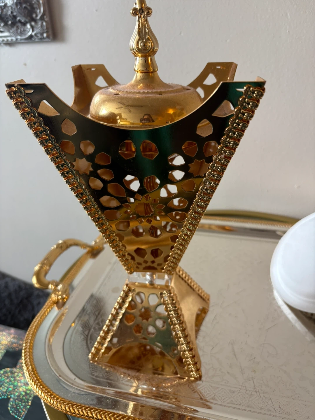 This is a decorative incense burner with a gold finish. It features intricate cut-out patterns. It's suitable for burning incense or as a decorative piece.