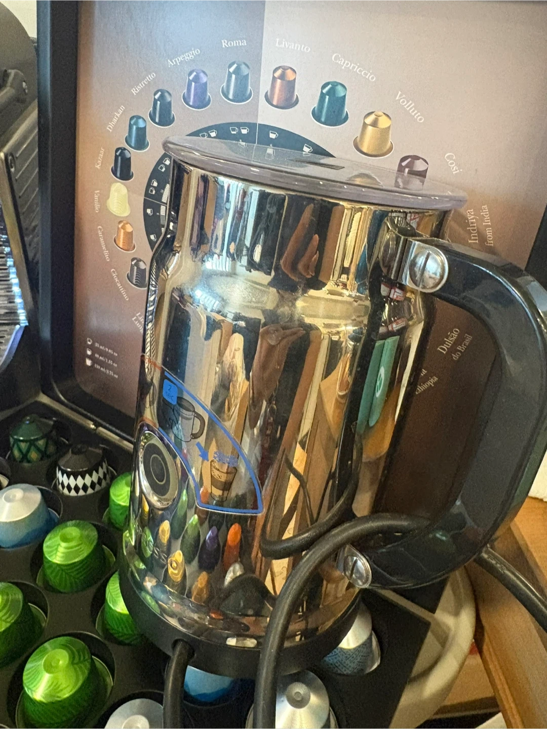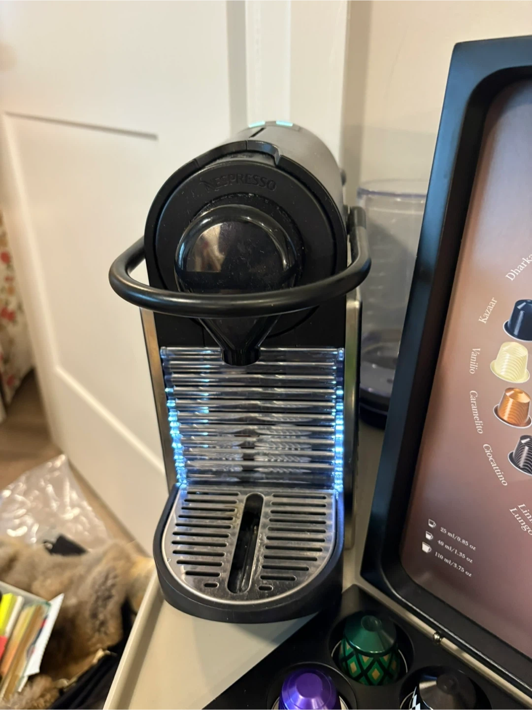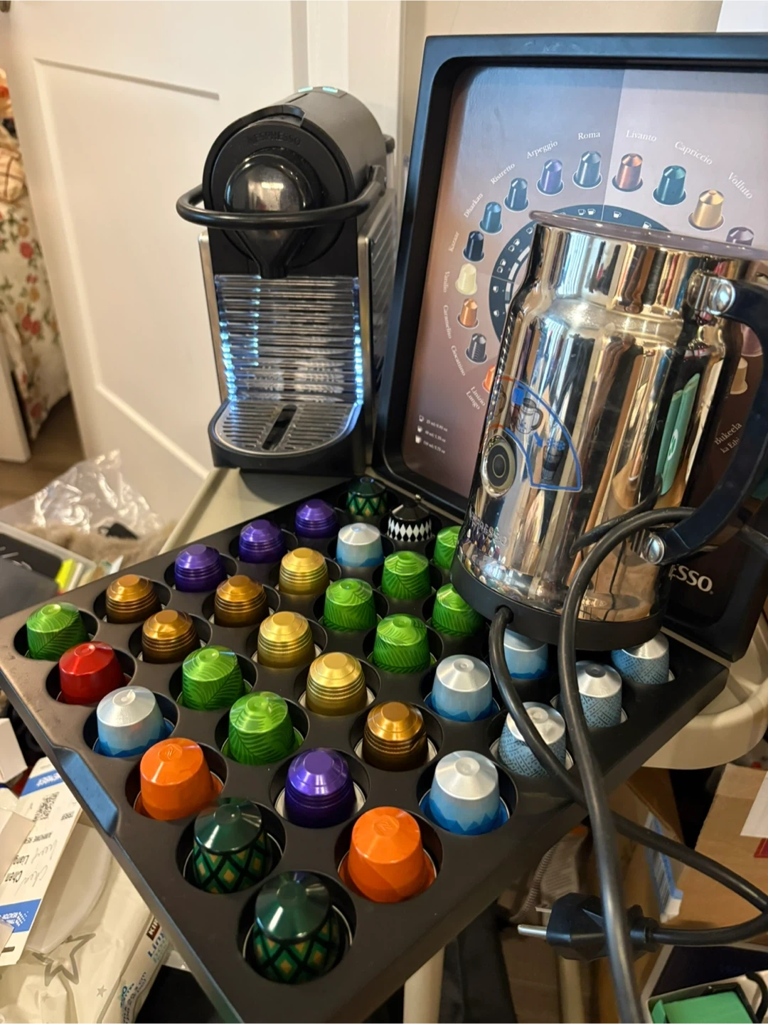 Nespresso original coffee machine and Aeroccino milk frother. Comes with a capsule holder filled with various coffee pods. Make your favourite espresso drinks at home. $120