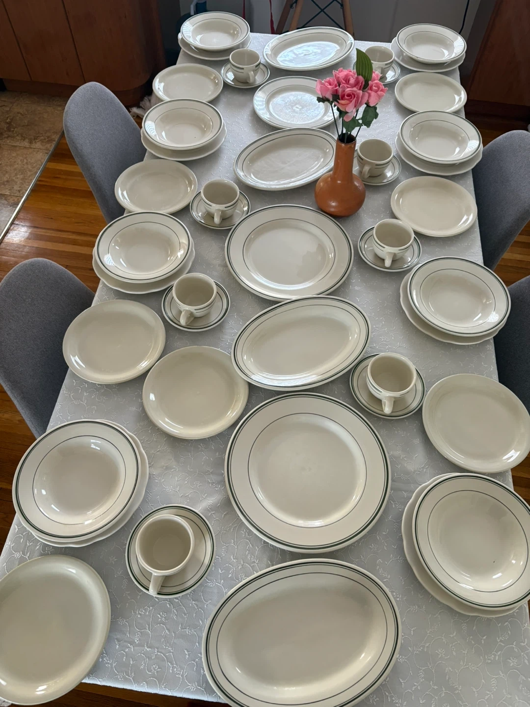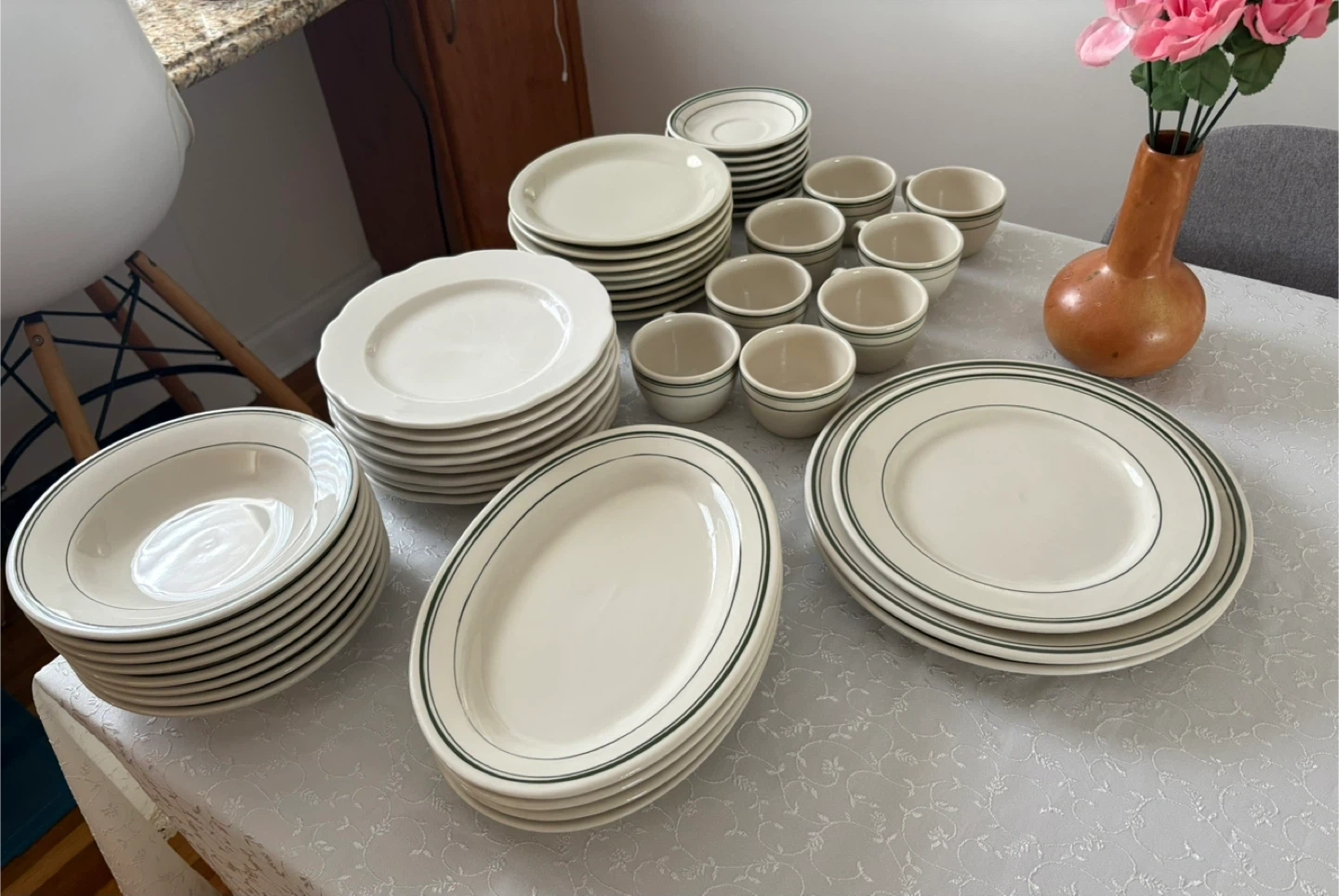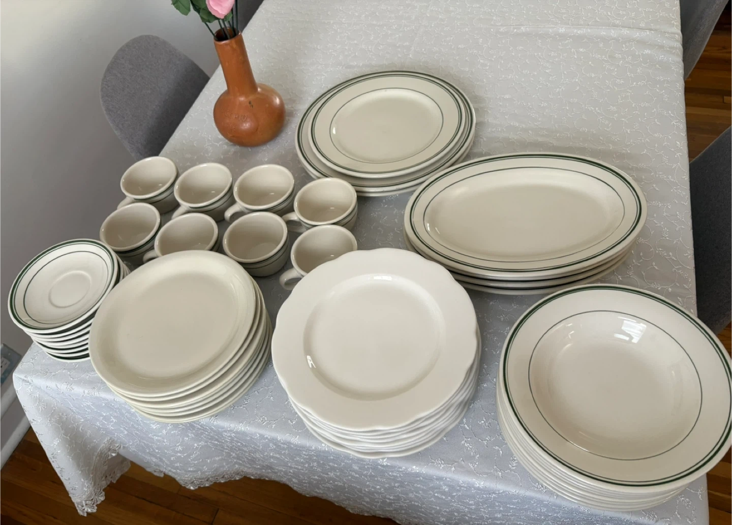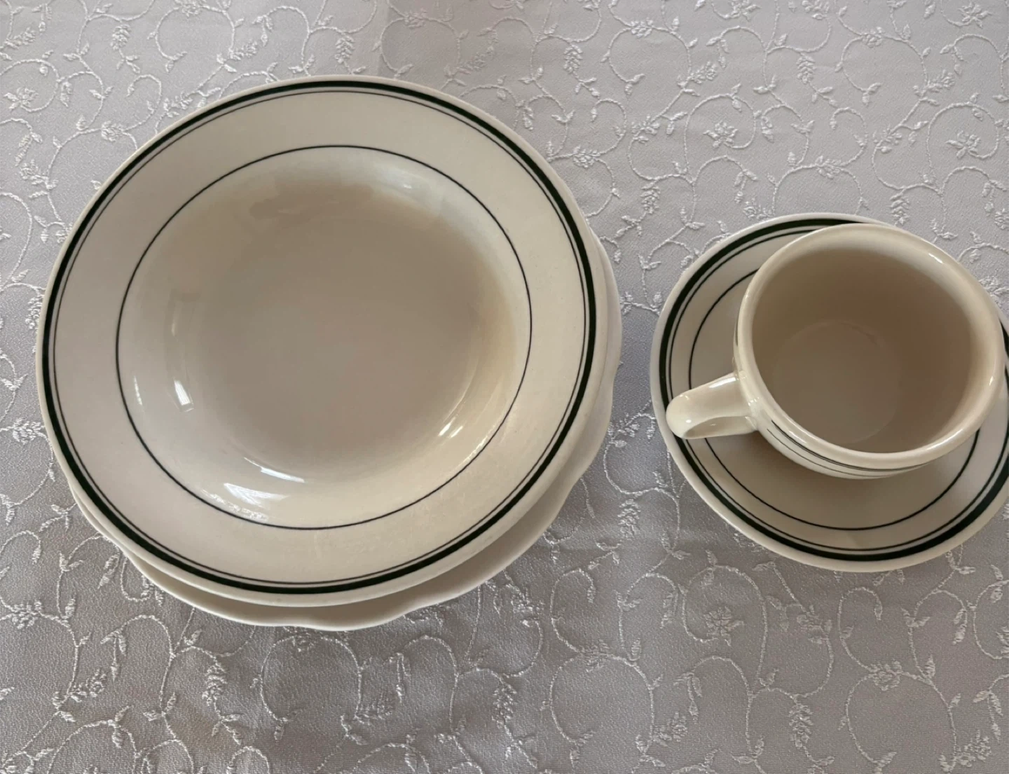 This set includes multiple dinner plates, bowls, and cups with saucers. They all feature a classic cream color with a simple green rim detail. This dinnerware is perfect for hosting guests or for everyday use!