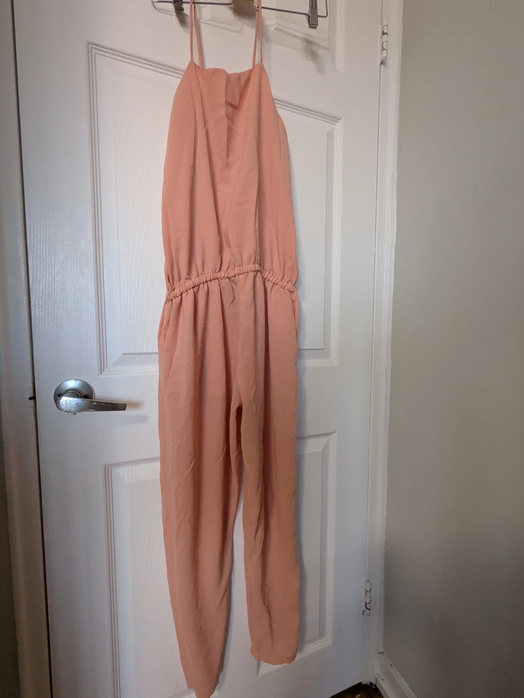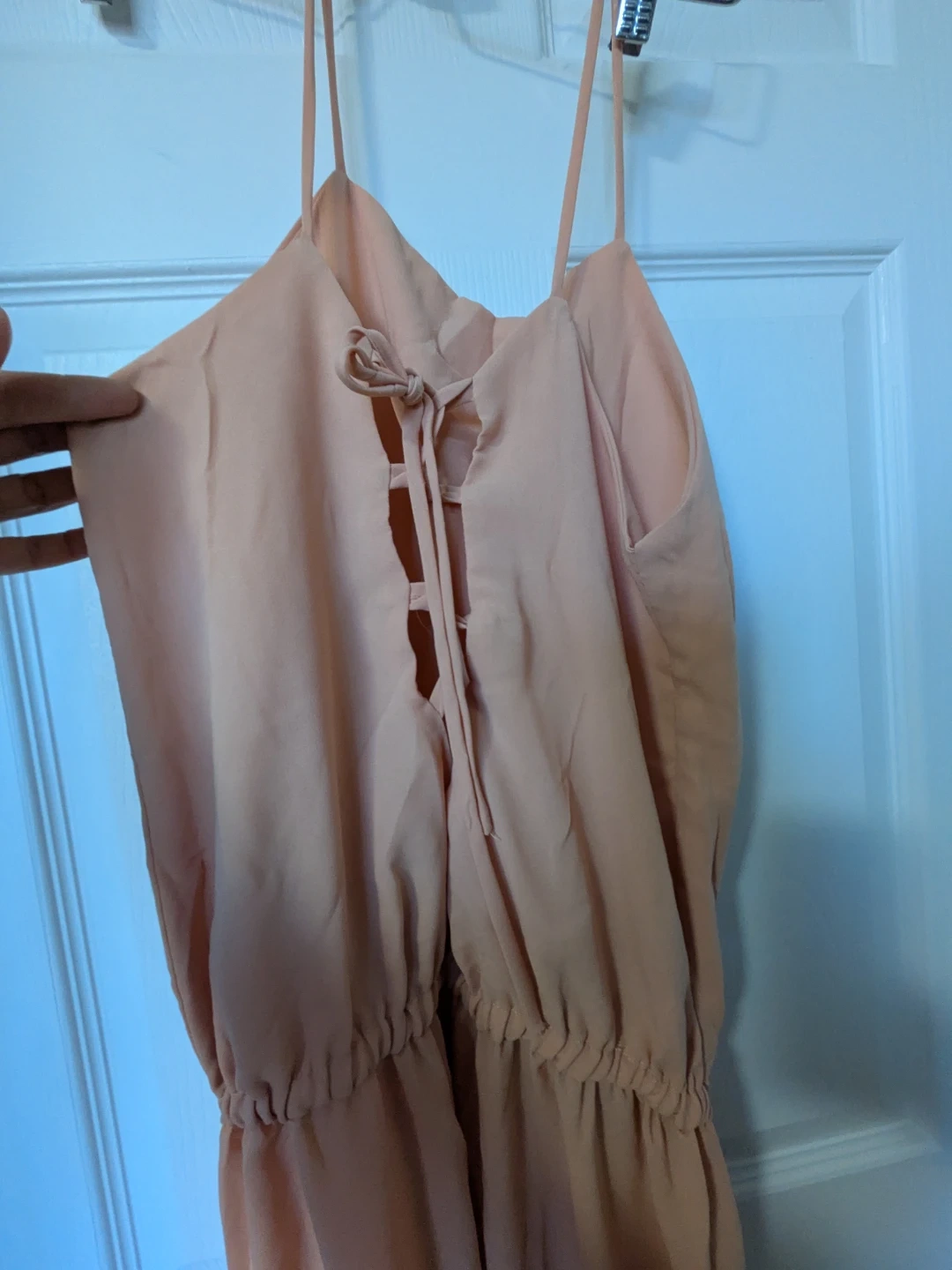 A lovely peach-coloured, strappy jumpsuit with a cinched waist and lace-up back detail. It's made from a lightweight material. Perfect for a casual outing or a summer day!