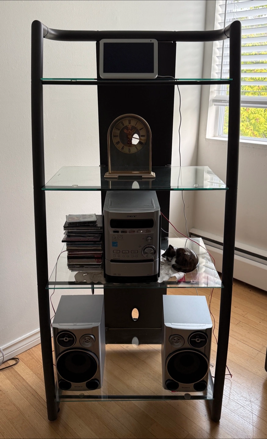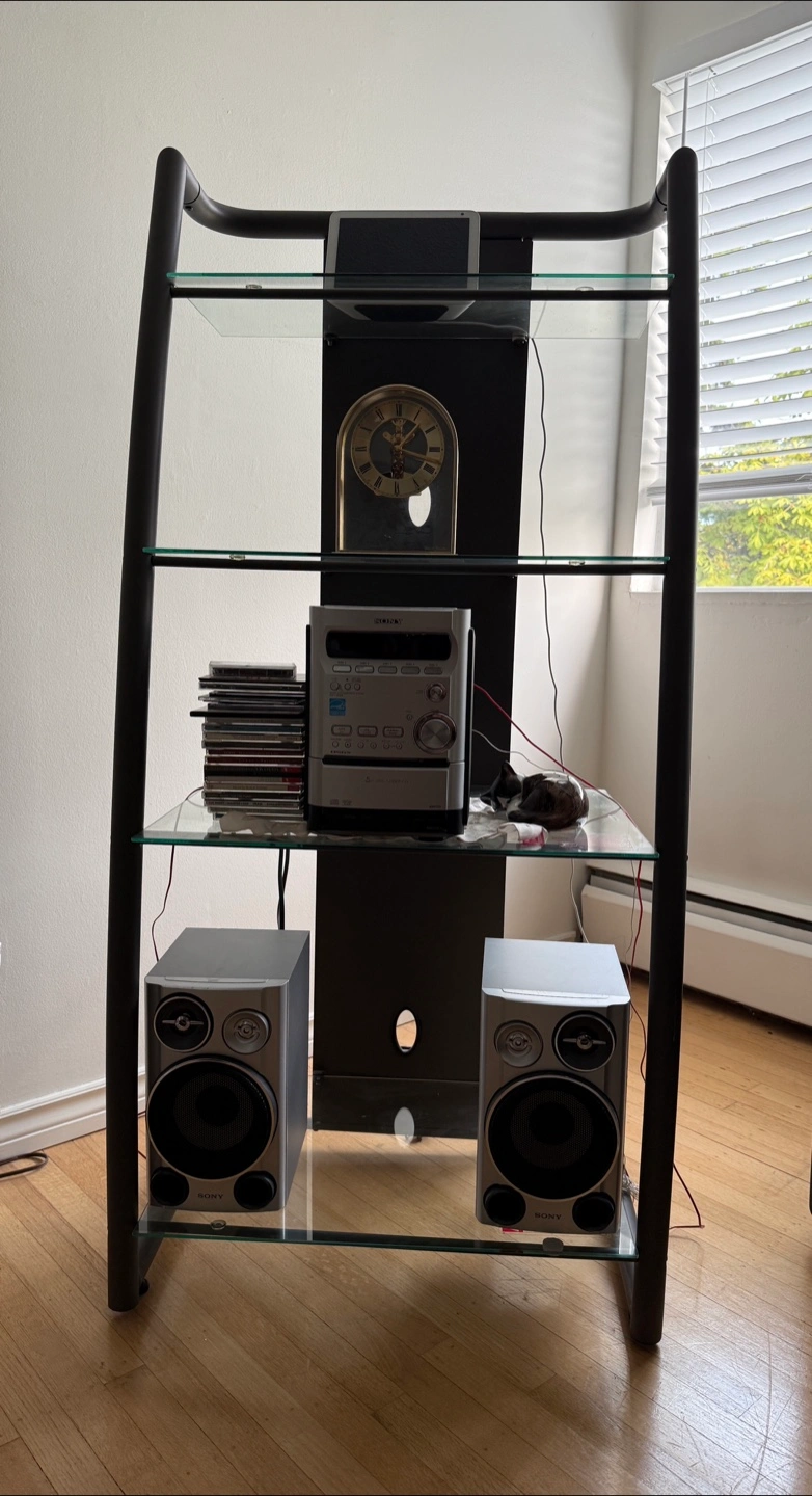 Selling a corner metal frame with 4 glass shelf unit, perfect for displaying your favourite items and Sound system Great for adding some tunes to any room in your home