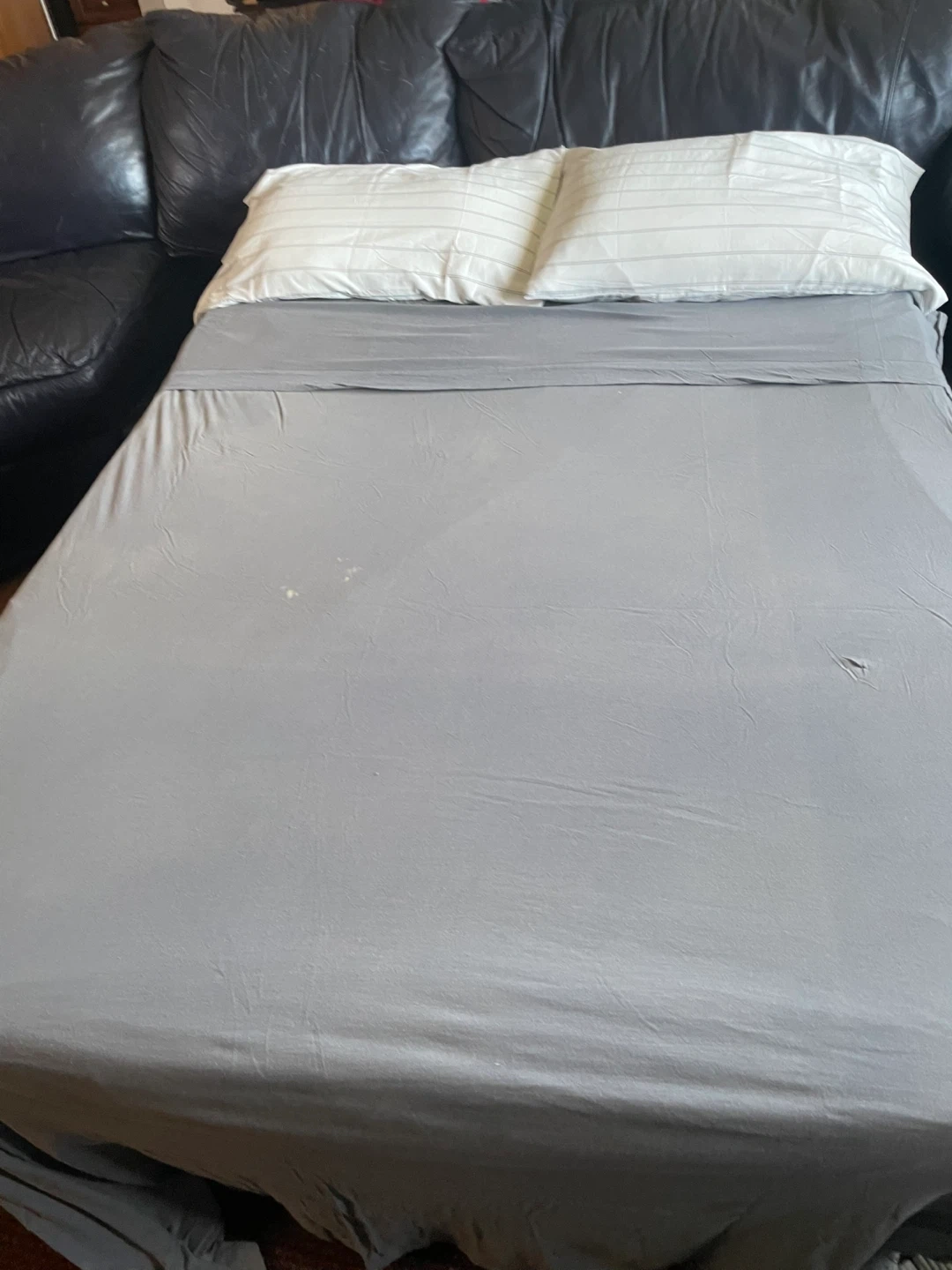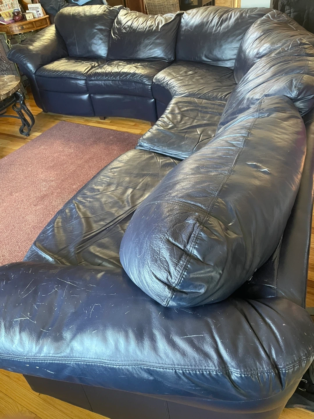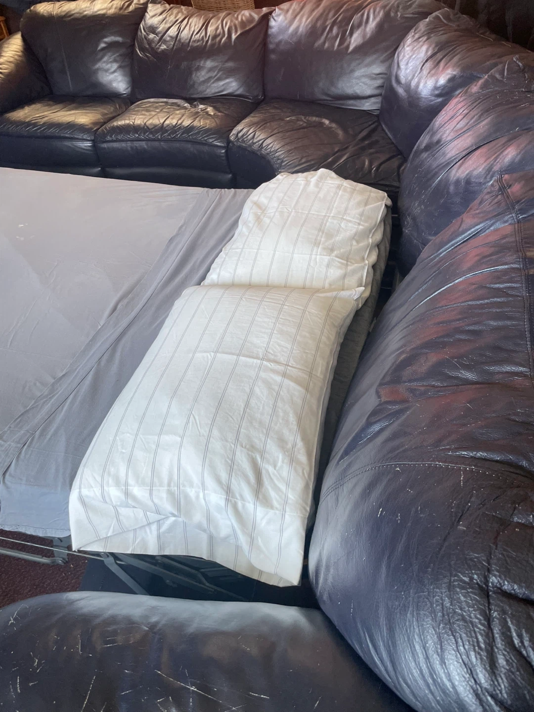This dark eggplant Natuzzi leather sectional sofa features a pull-out sofa bed. It's in good condition and ready for a new home. Needs 2 or more grand it’s for pick up … negotiable needs to go