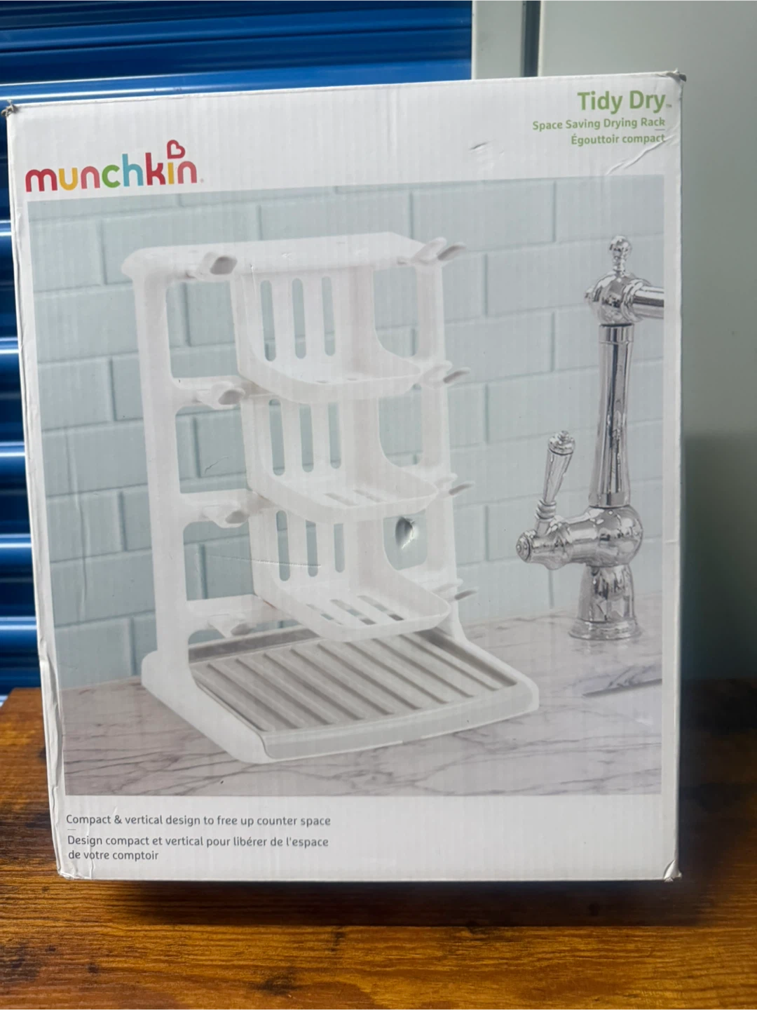 This is a Munchkin Tidy Dry space-saving drying rack. It has a compact and vertical design to help free up counter space. This rack is useful for drying baby bottles and accessories.