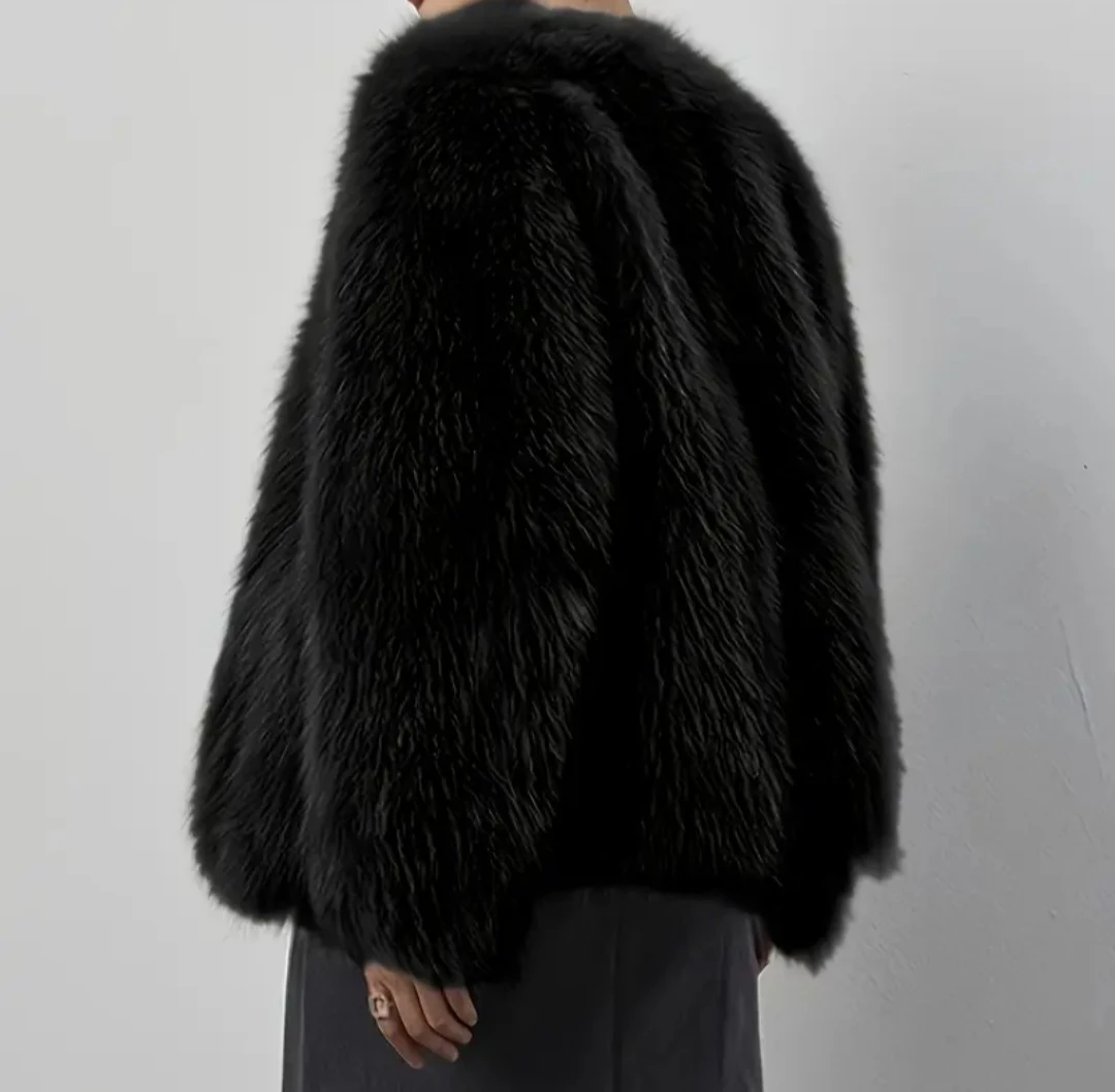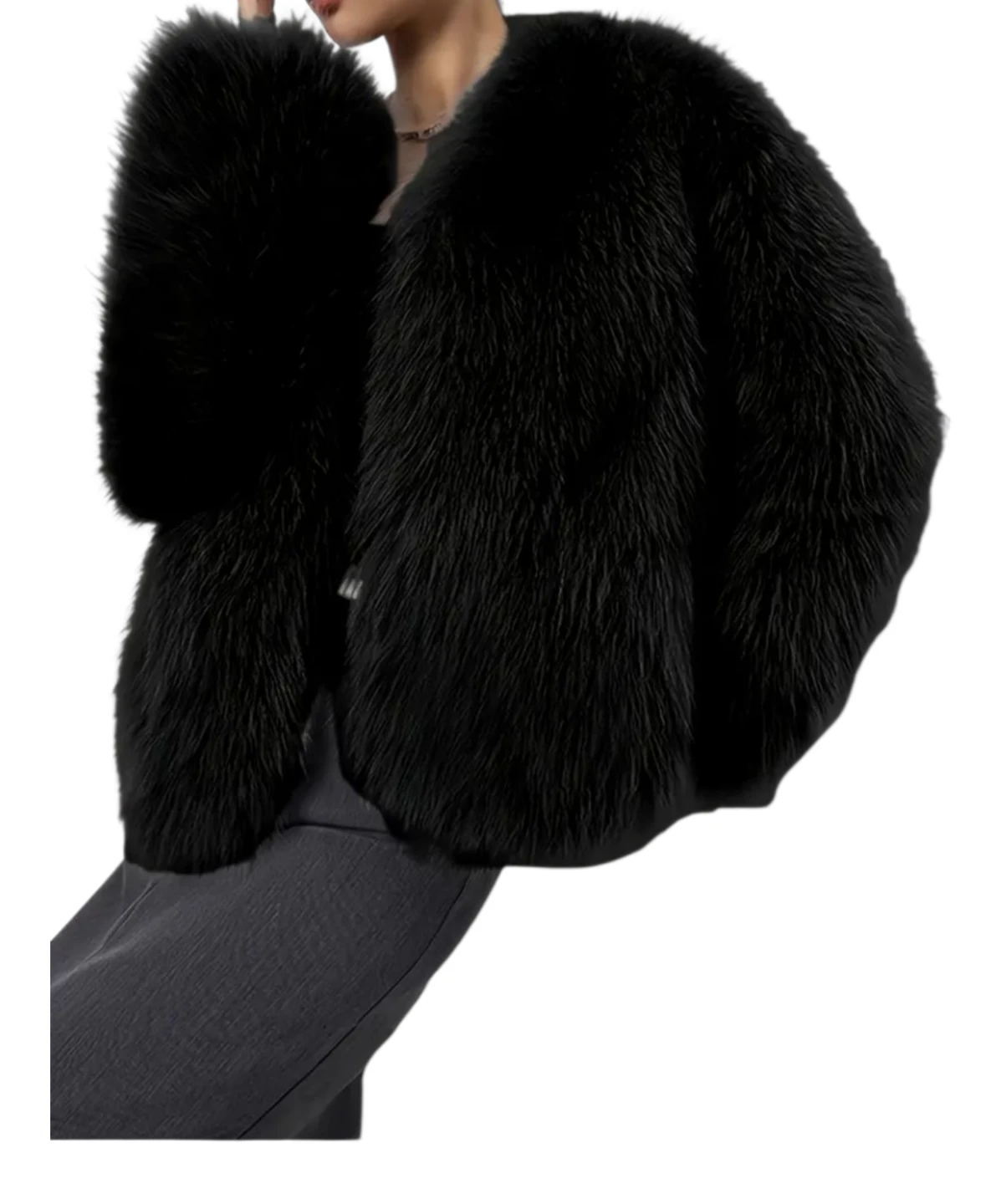This black faux fur jacket offers a cozy and stylish look. It's a short, cropped style with long sleeves. Adds a touch of glamour to any outfit!