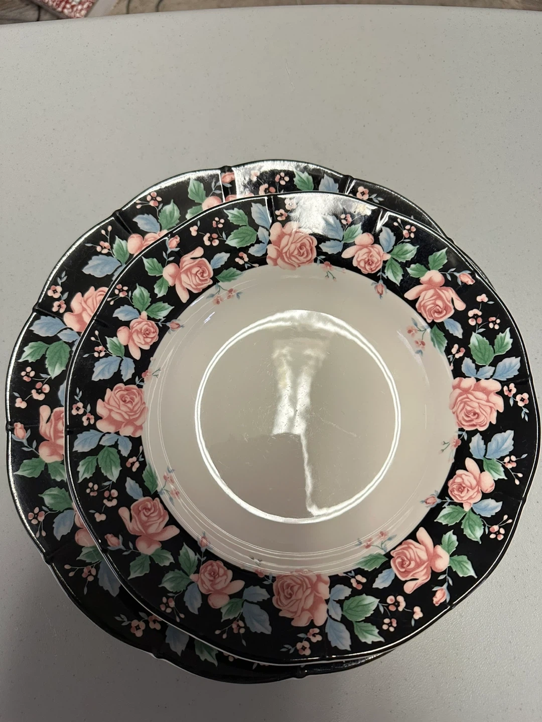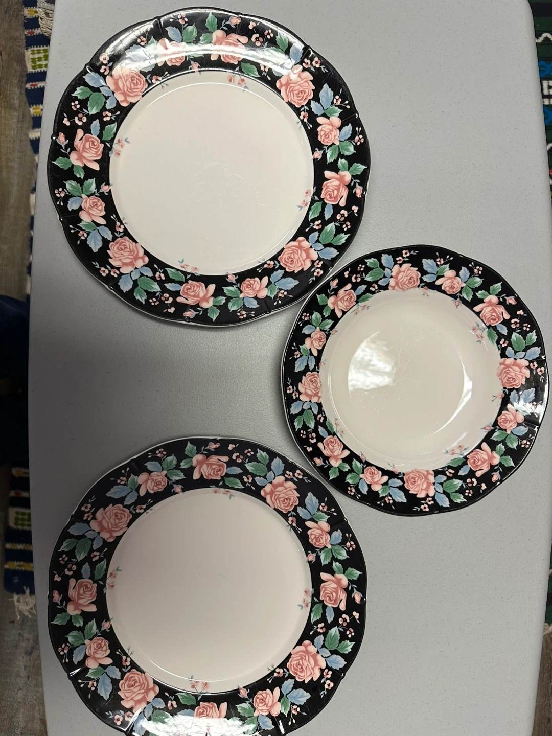 Sango Victoria's Garden dinner plates with a floral rose pattern on a black border. 2 plates and one bowl. Oven, microwave and dishwasher safe. Part of the Victoria's Garden collection.