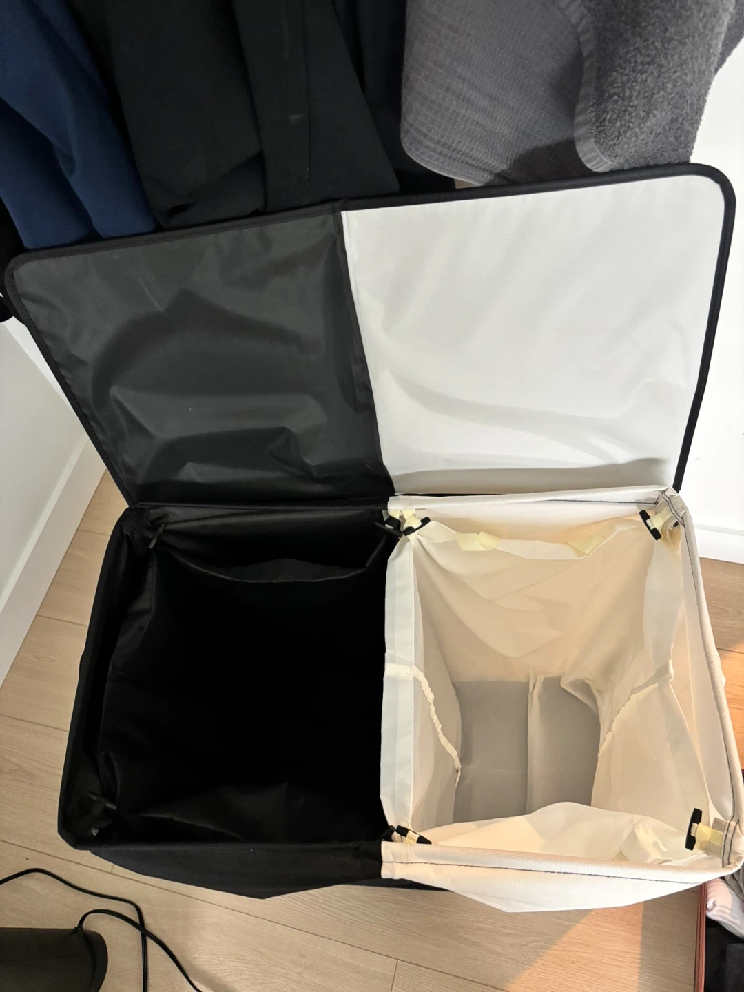 This laundry hamper features two separate compartments for sorting clothes. It's made of fabric and has a lid. This hamper is great for organizing laundry.